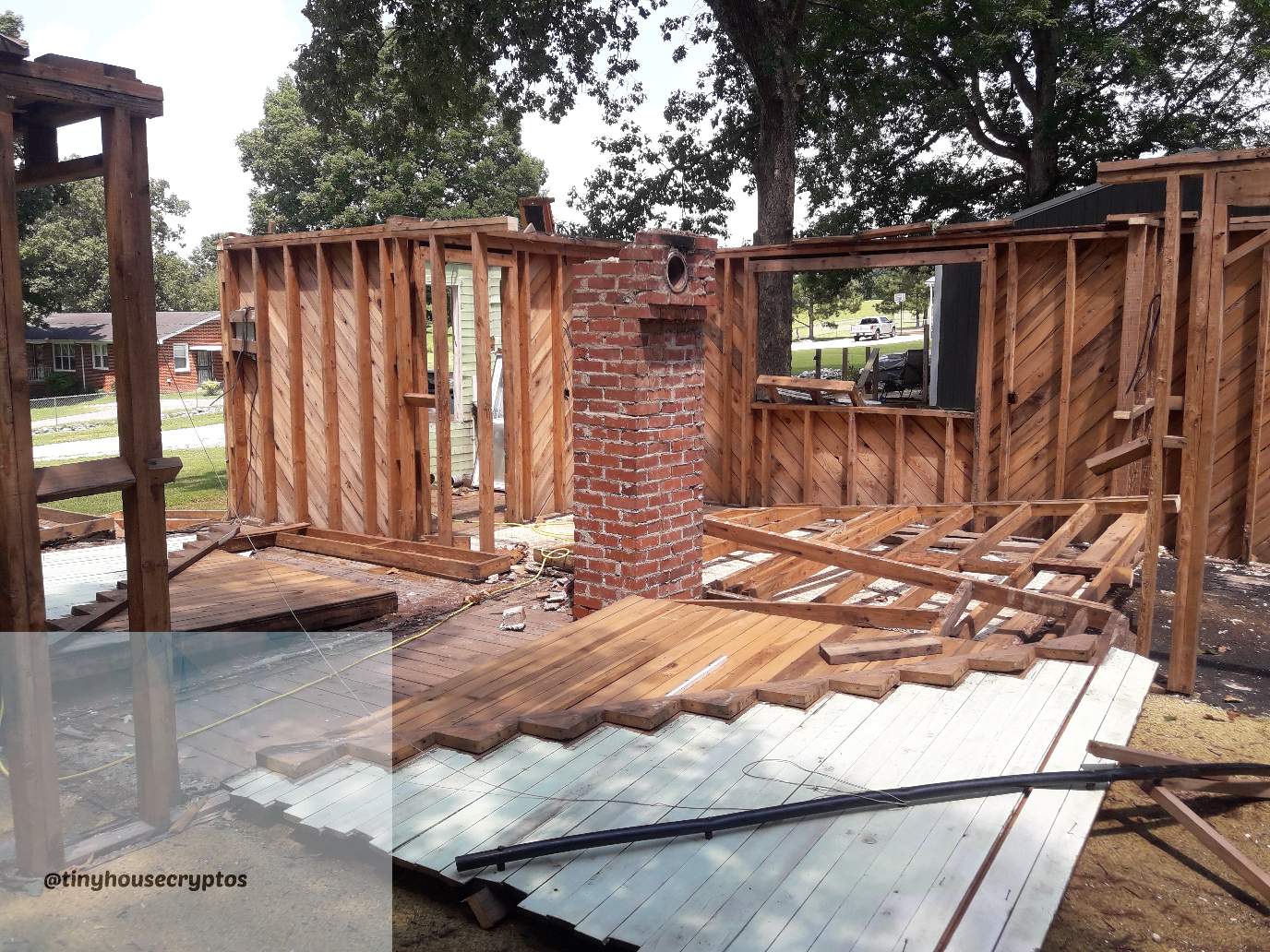 Been awhile since being here on Steemit... our internet had been knocked out by a severe thunderstorm! The power lines got hit by lightning and "fried" our router box! So, I'm having to do everything from my phone now until we get our new internet router from AT&T. So, here's another update series of photos on my huge project undertaking... the taking down of a free house that I've received and going to upcycle the materials in future build projects of mine.