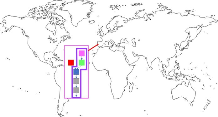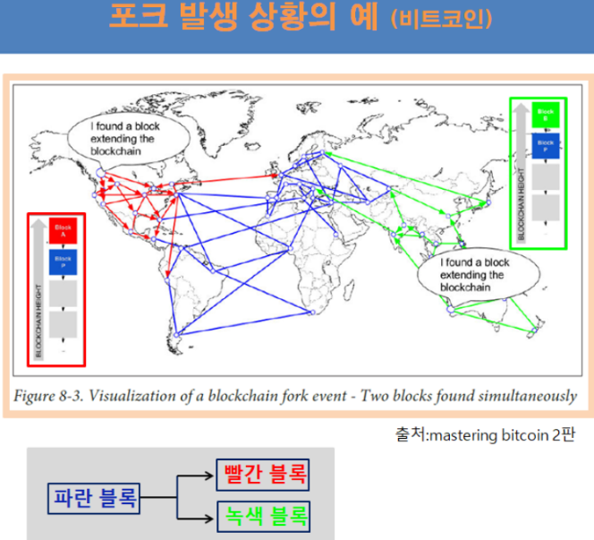 노드 간 떨어져 있는 거리와 전송속도에 따라 특정 시점에서 노드 마다 블록체인이 다르게 구성될 수 있다. 예를 들어 A국가에 있던 노드에는 파랑블록 다음에 빨강블록이 자식으로 연결되어 있는 상태*(자식으로 연결되었다는 의미는 바로 앞 블록의 블록해쉬를 포함하고 있음을 의미)였는데, 초록블록이 뒤늦게 전달되어 파랑블록 다음에 자식으로 연결됨으로써 포크(fork)가 발생한다. 이렇듯 한 부모에 대해 자식 블록이 여러 개가 생기는 상황을 포크(fork)라고 하며, 포크가 된 상황은 각 노드가 소유하고 있는 분산장부 간에 일치되지 않는 상태를 유발하게 된다.