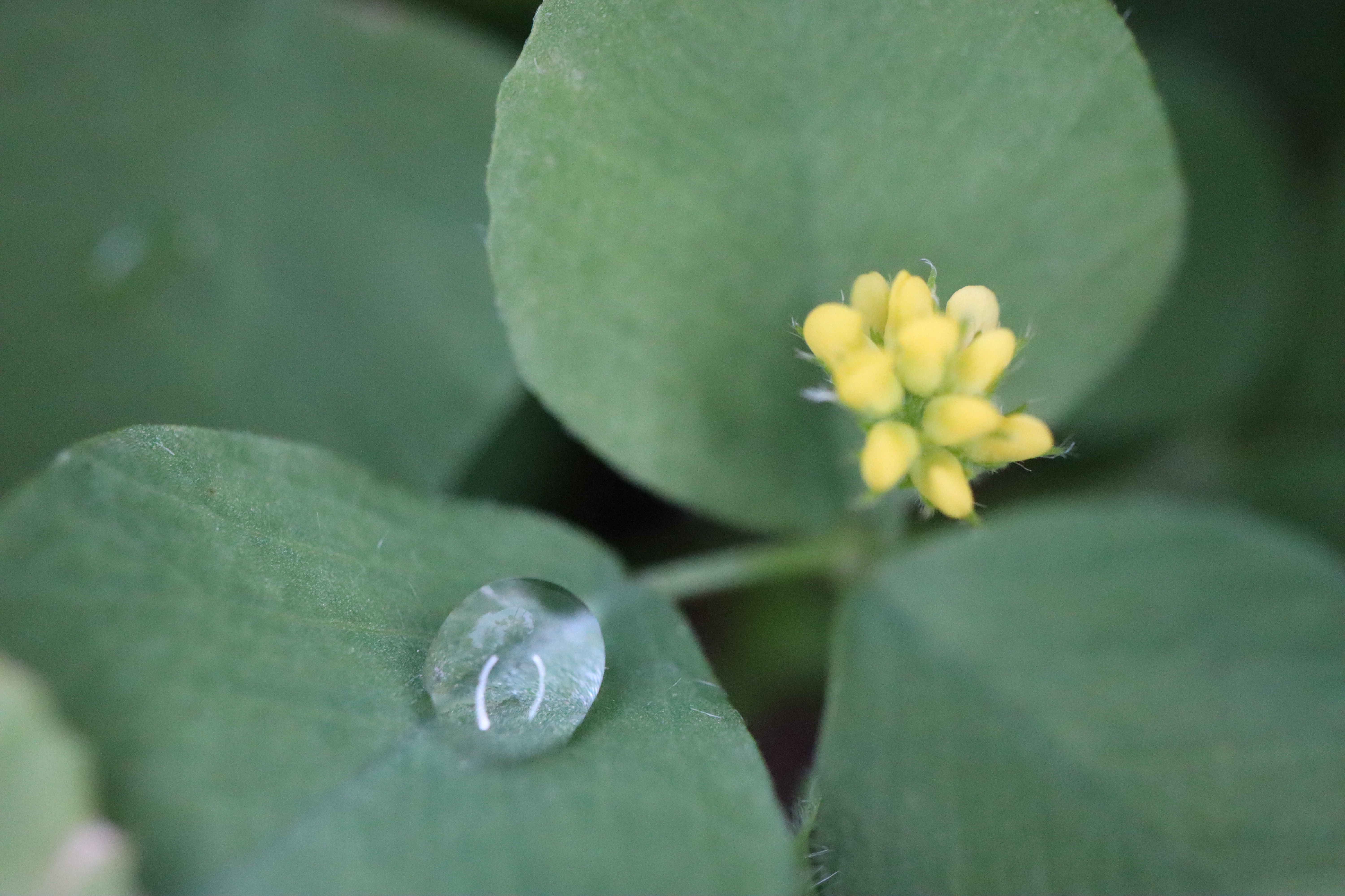The photo used the macro lens on a very tiny cluster of flowers growing on a plant in our kettle pond. You can see just how tiny by comparing them to the drop of water. This was handheld and manually focused, so the photo is a bit blurry.