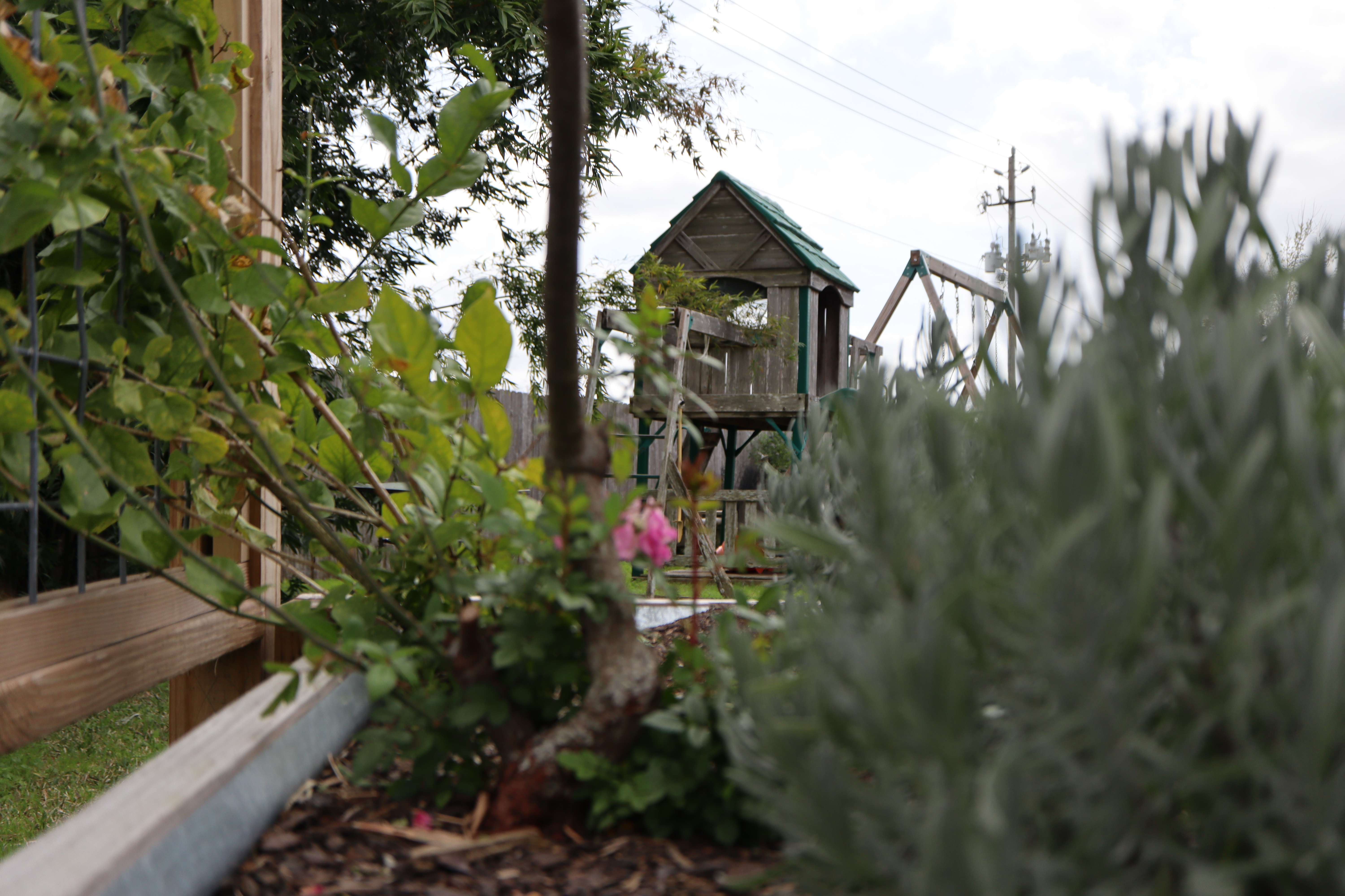 One our daughters took the camera out with the macro lens to explore. I think the two shots below are the best ones she took. The first is of our cat Roman. The second looks through a rose planter at the playset.