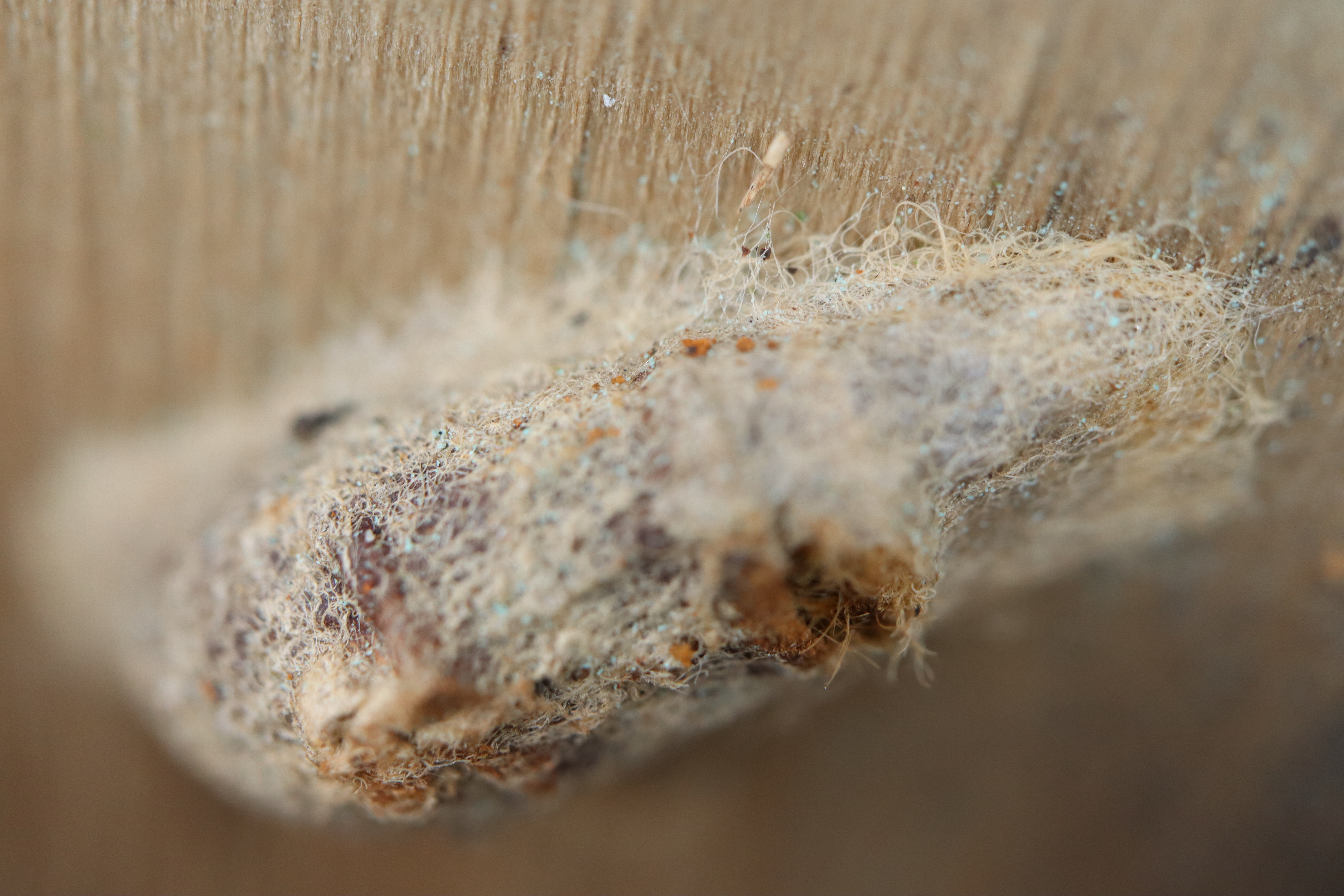 The next is a photo of an asp's cocoon bedded down near our front door. An asp is a caterpillar that turns into a moth. For some reason we had 50 or 60 asps coming to our front door to find a place to set their cocoon. We usually won't disturb beneficial insects, but the asp caterpillar has dangerous venomous spines, which, if touched, cause extreme pain as if you have a broken bone. It can even cause other effects, such as chest pain, or difficulty breathing. Since they were all over our front door area we had to keep spraying them off. One of our daughters accidently stepped on an area where one HAD BEEN and got quite a painful sensation from it.