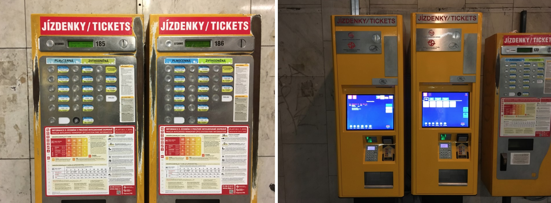 좌) 구버전 오직 동전만 이용 가능한 티켓 판매 기계 우) 신버전 동전과 카드까지 결제가 가능