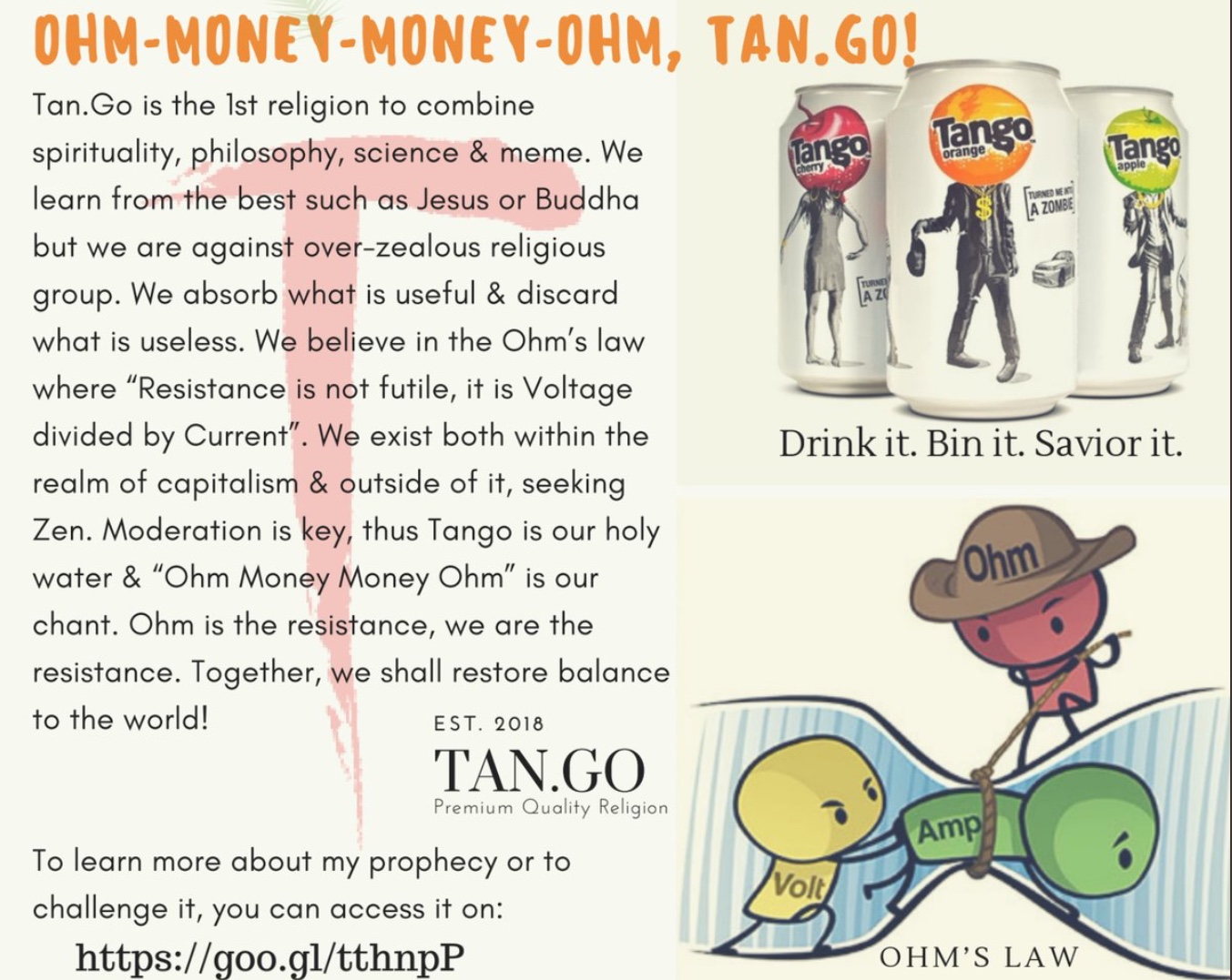 Tan.Go is the 1st religion to combine spirituality, philosophy, science & meme. We learn from the best such as Jesus or Buddha but are against over-zealous religious group. We absorbe what is useful & discard what is useless. We believe in the Ohm’s law where “Resistance is not futile, it is voltage divide by current”. We exist both within the realm of capitalism & outside of it, seeking Zen. Moderation is key, thus Tango is our holy water & “Ohm Money Money Ohm” is our chant. Ohm is the resistance. Together, we shal restore balance to the world!