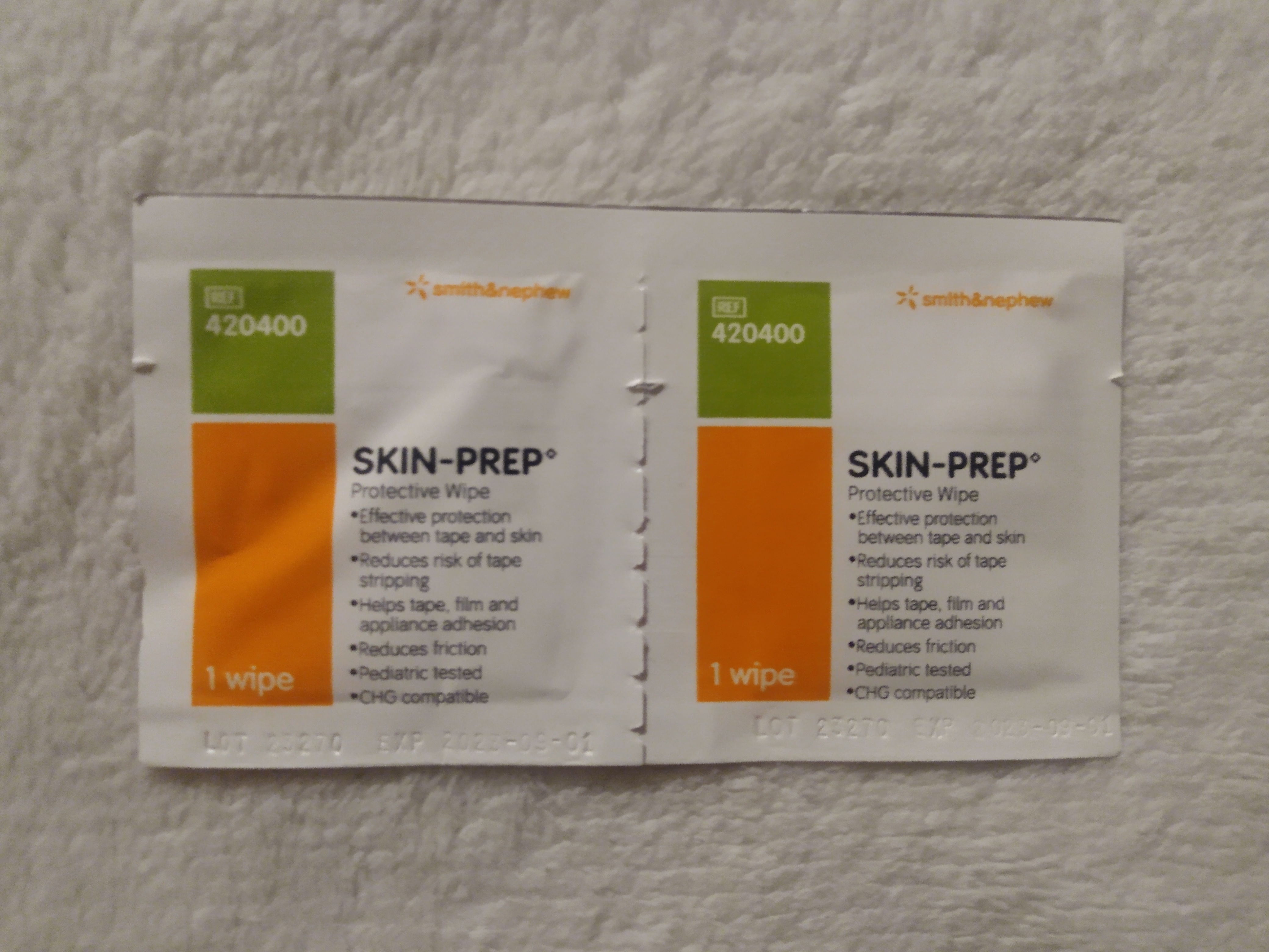 They look like an alcohol pad, except they won't sting a wound, and they leave a protective layer over the top of the skin. This layer allows the tape a better surface to grip, while keeping the adhesive from attacking the skin itself!