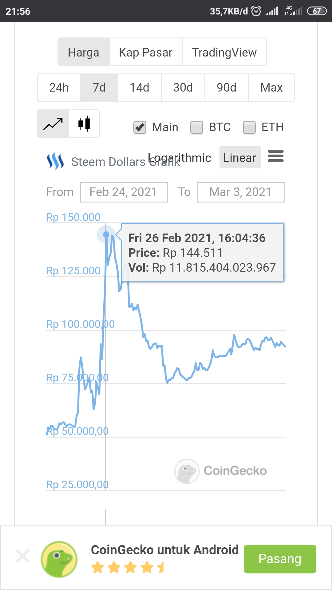 Berbicara tentang harga steem dolar, tentunya belakangan ini kita lihat mengalami kenaikan yang signifikan, bahkan sempat menyentuh harga 144.000.00 Rupiah.