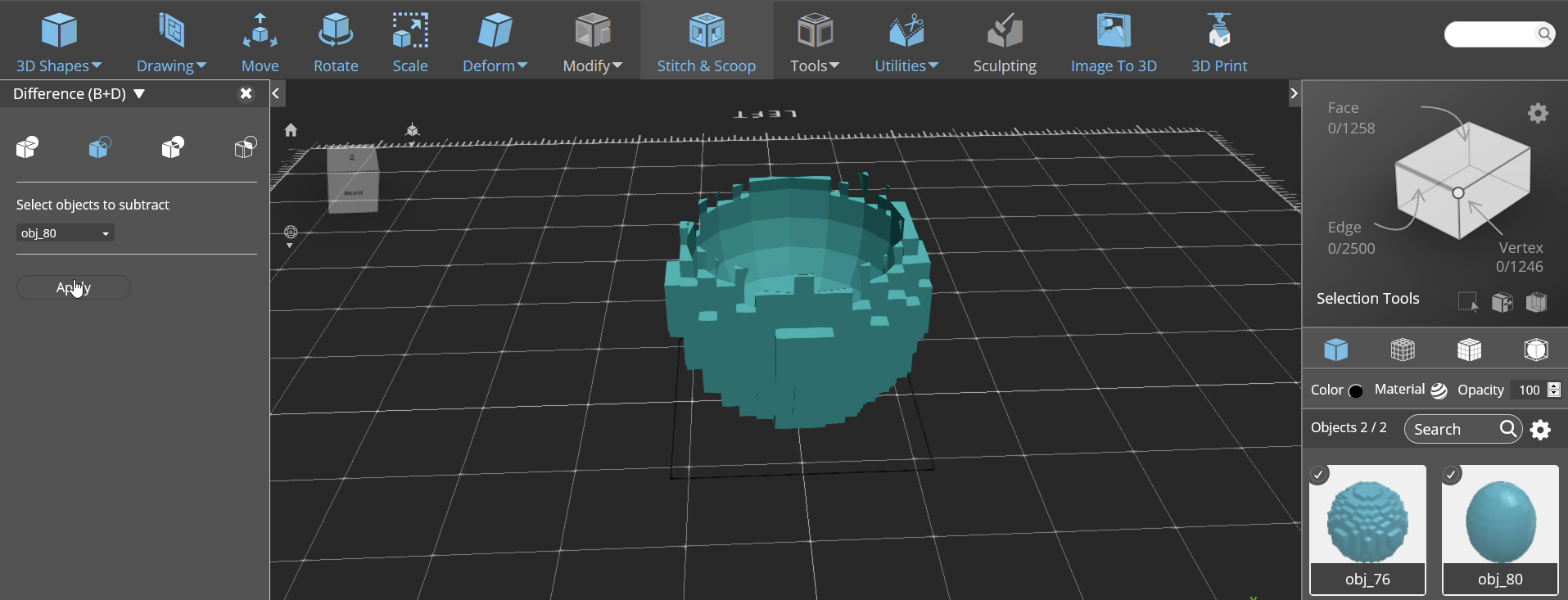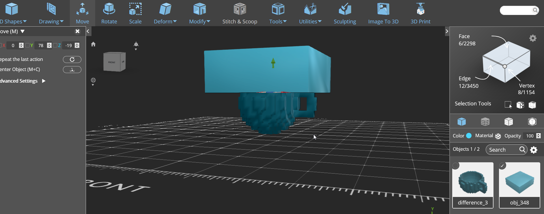 After adjusting that parameter slightly, I then moved it upwards and used the Stitch and Scoop tool to remove one from the other: