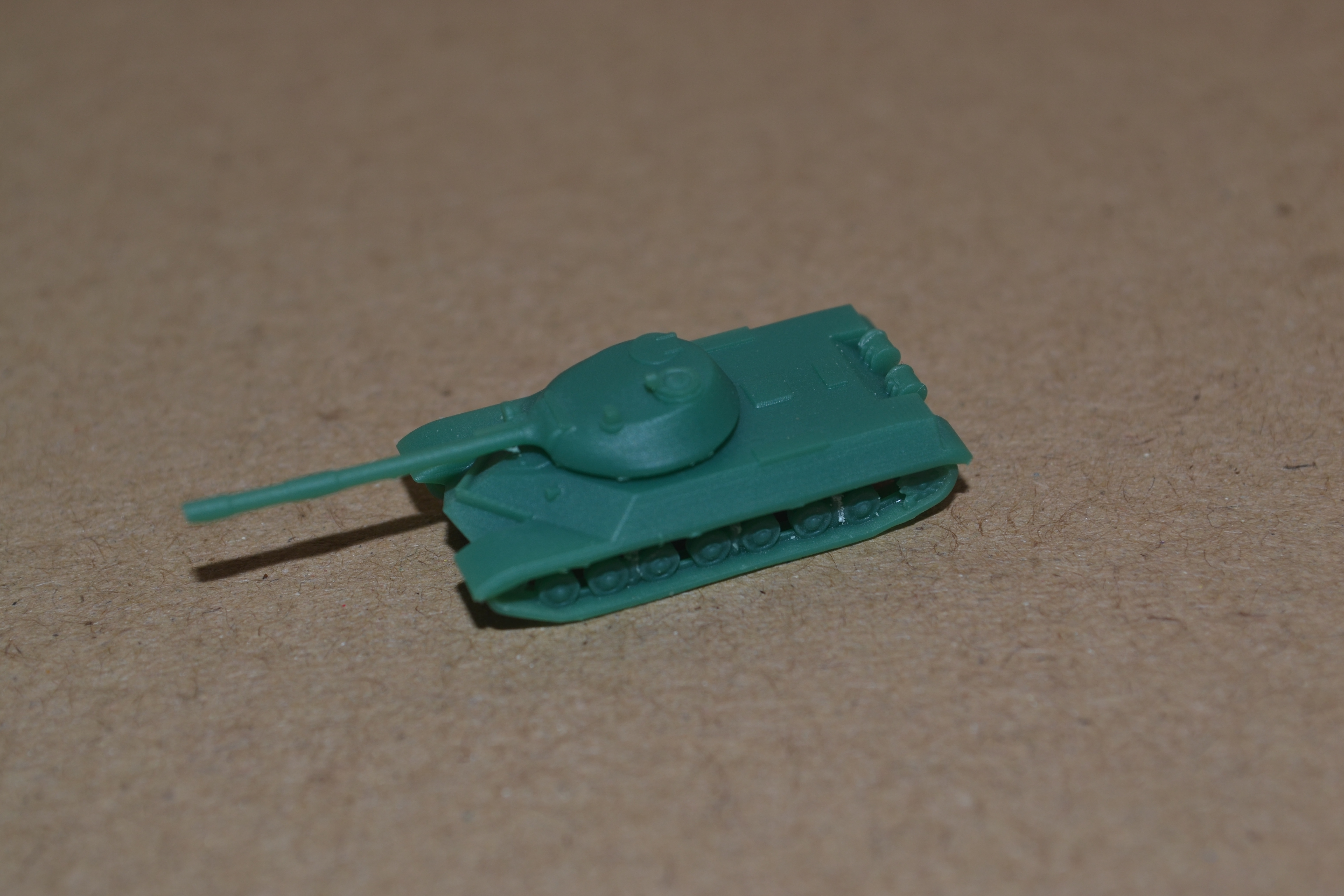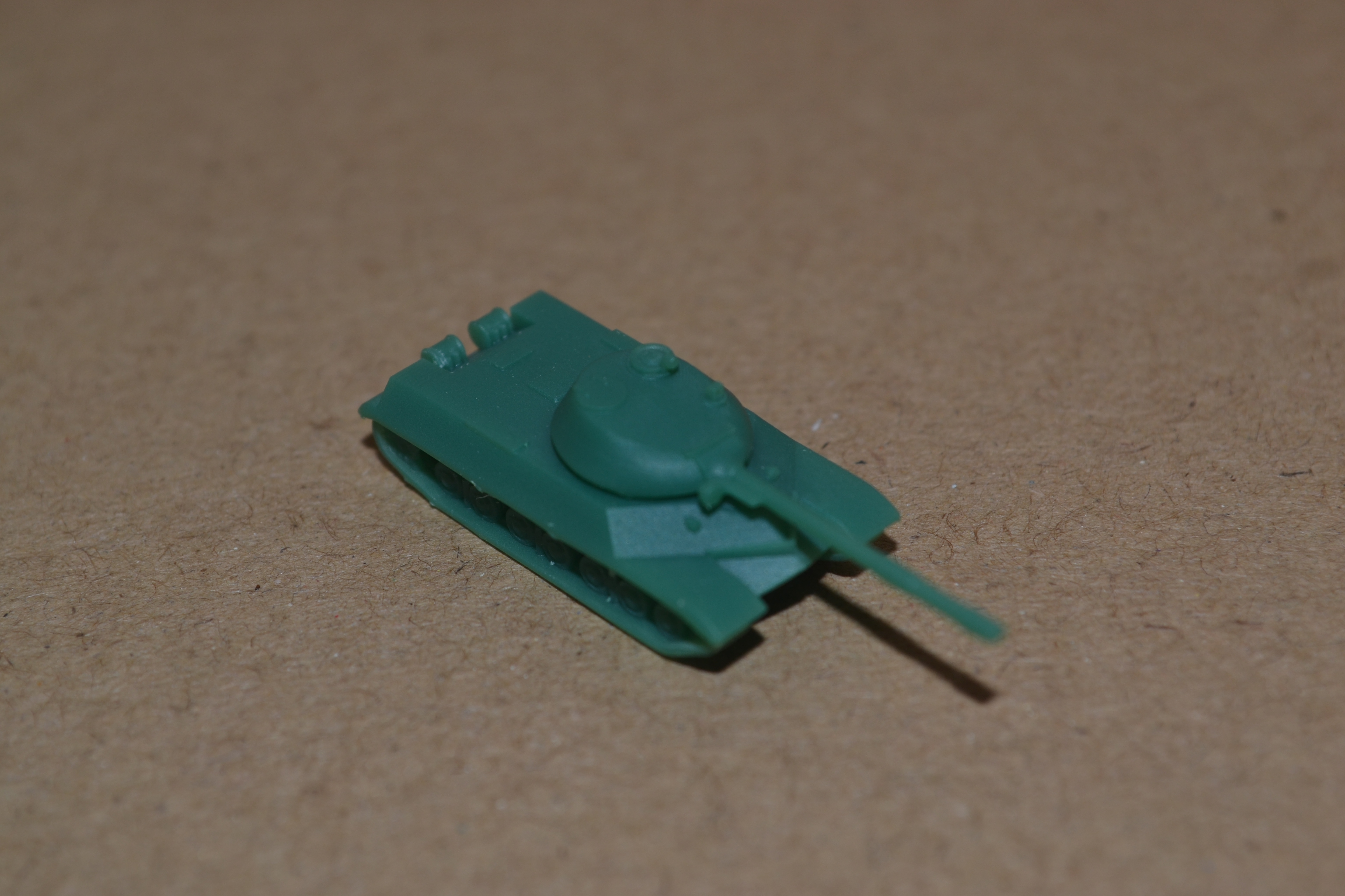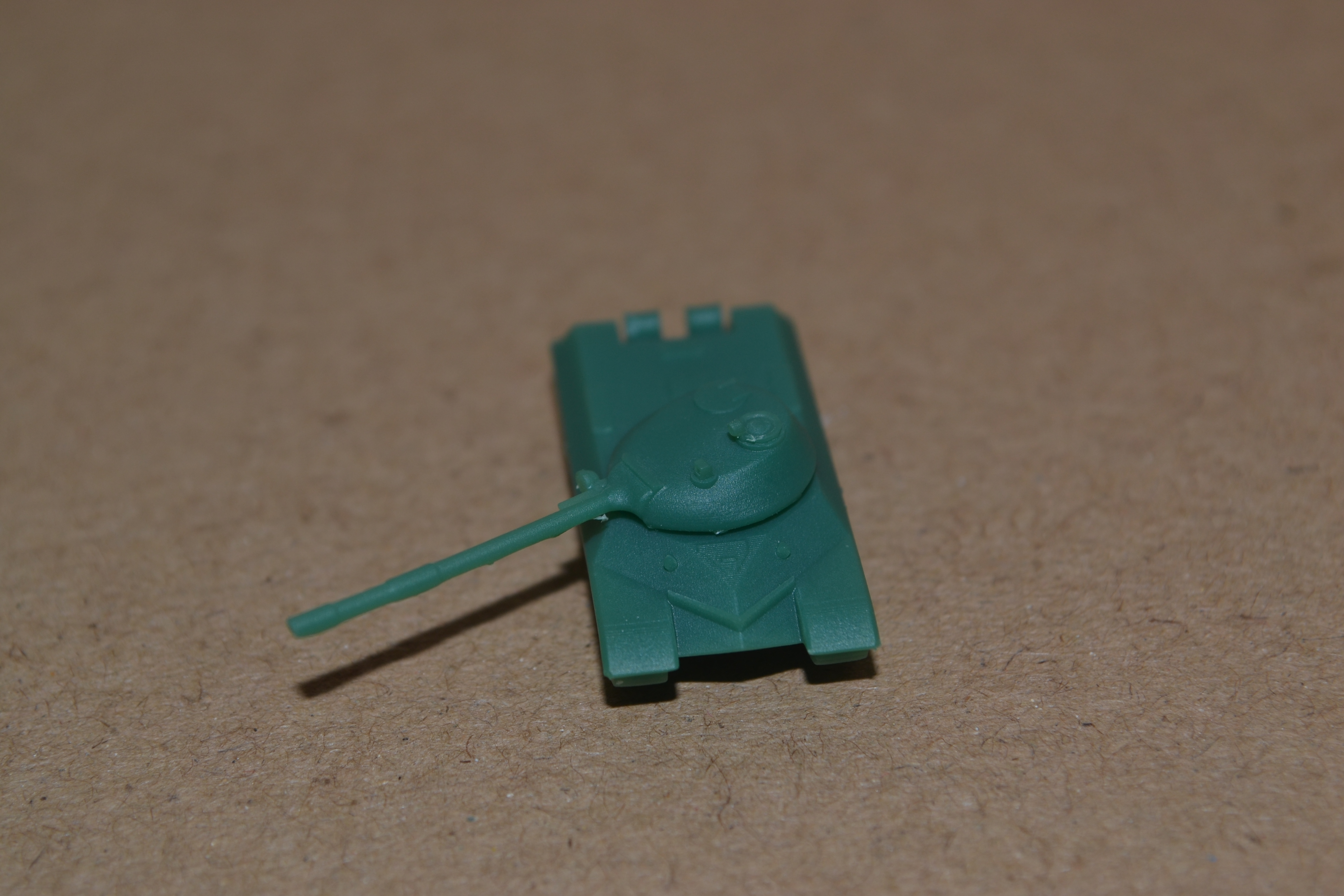 Today, I printed another T-10M, and it turned out much better than yesterday's. Not only did I succeed in not breaking the main gun, but I also managed to remove the majority of the supports without marring the surface prior to curing. I guess I'm getting used to working with coloured resin faster than I thought I would. I also printed this model with 25-micron layers, so the print lines almost completely disappeared. Take a look: