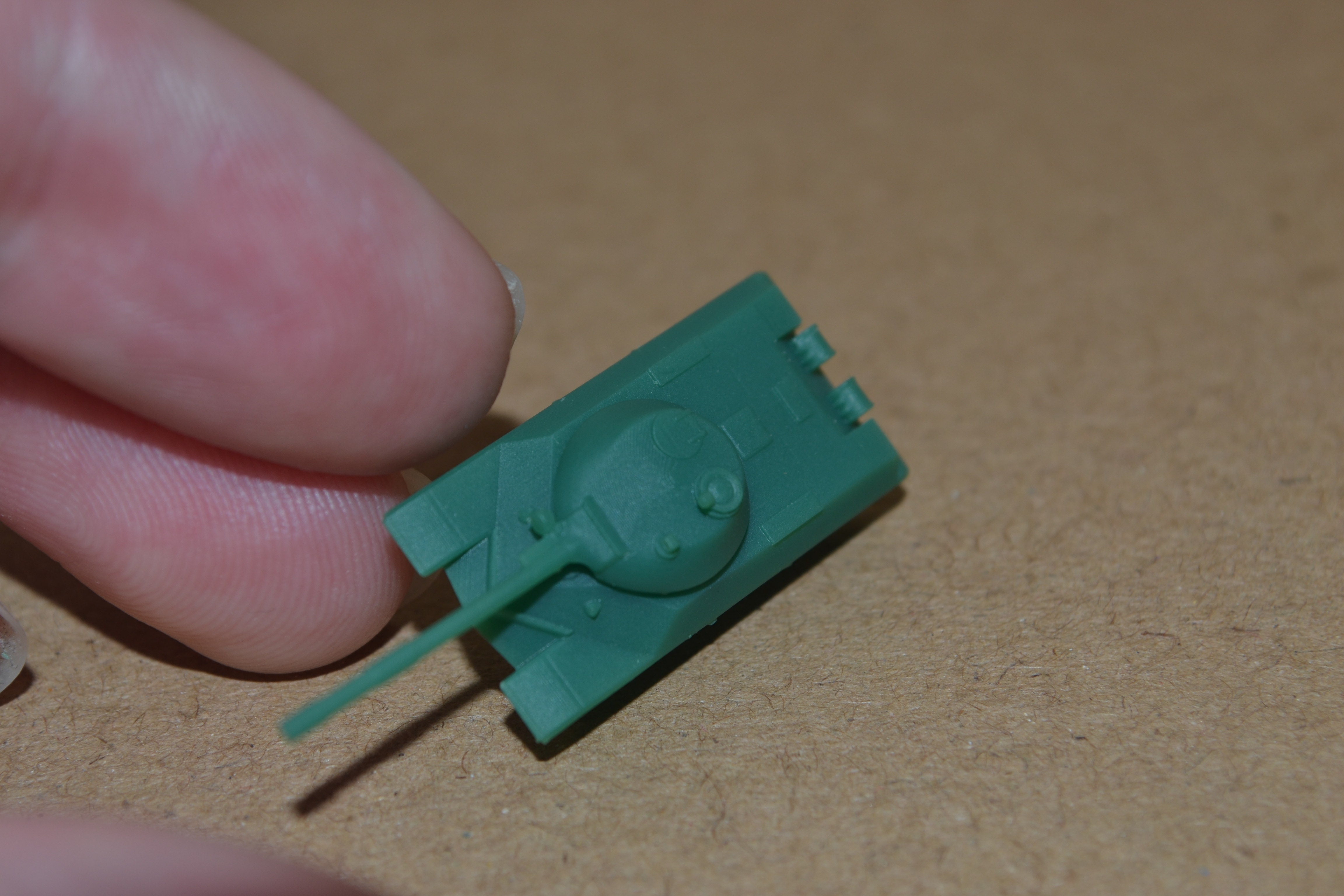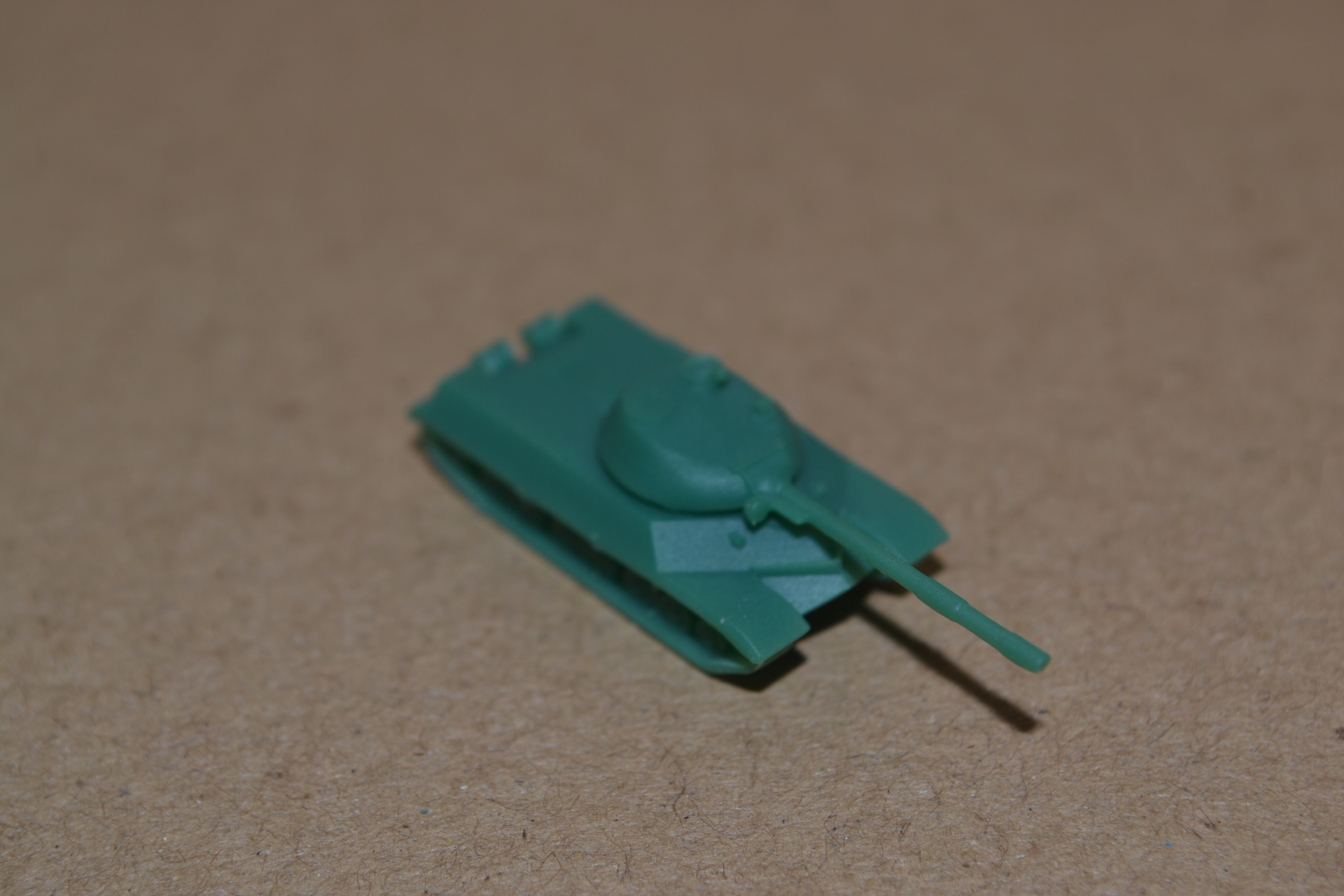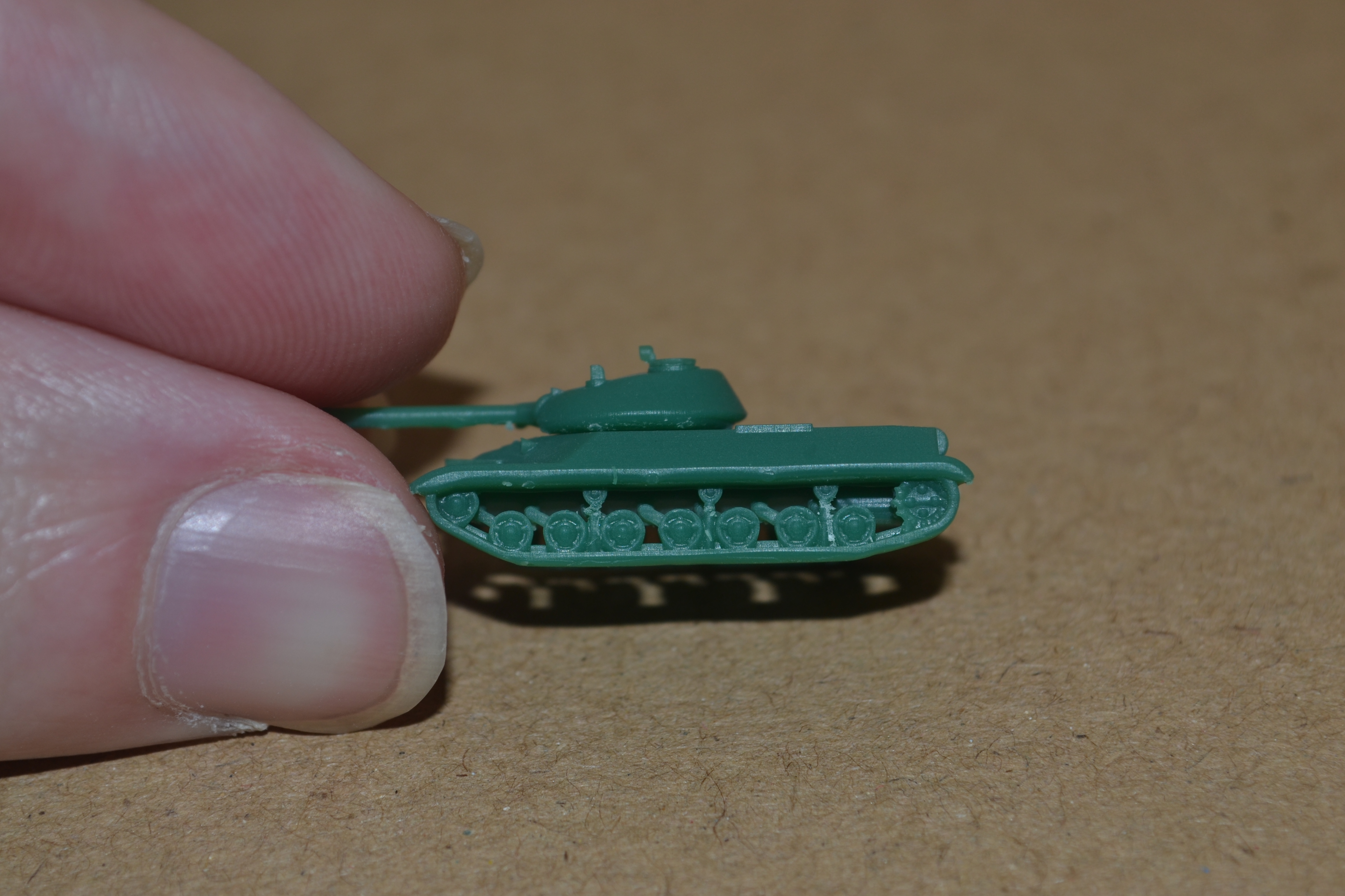 Today, I printed another T-10M, and it turned out much better than yesterday's. Not only did I succeed in not breaking the main gun, but I also managed to remove the majority of the supports without marring the surface prior to curing. I guess I'm getting used to working with coloured resin faster than I thought I would. I also printed this model with 25-micron layers, so the print lines almost completely disappeared. Take a look: