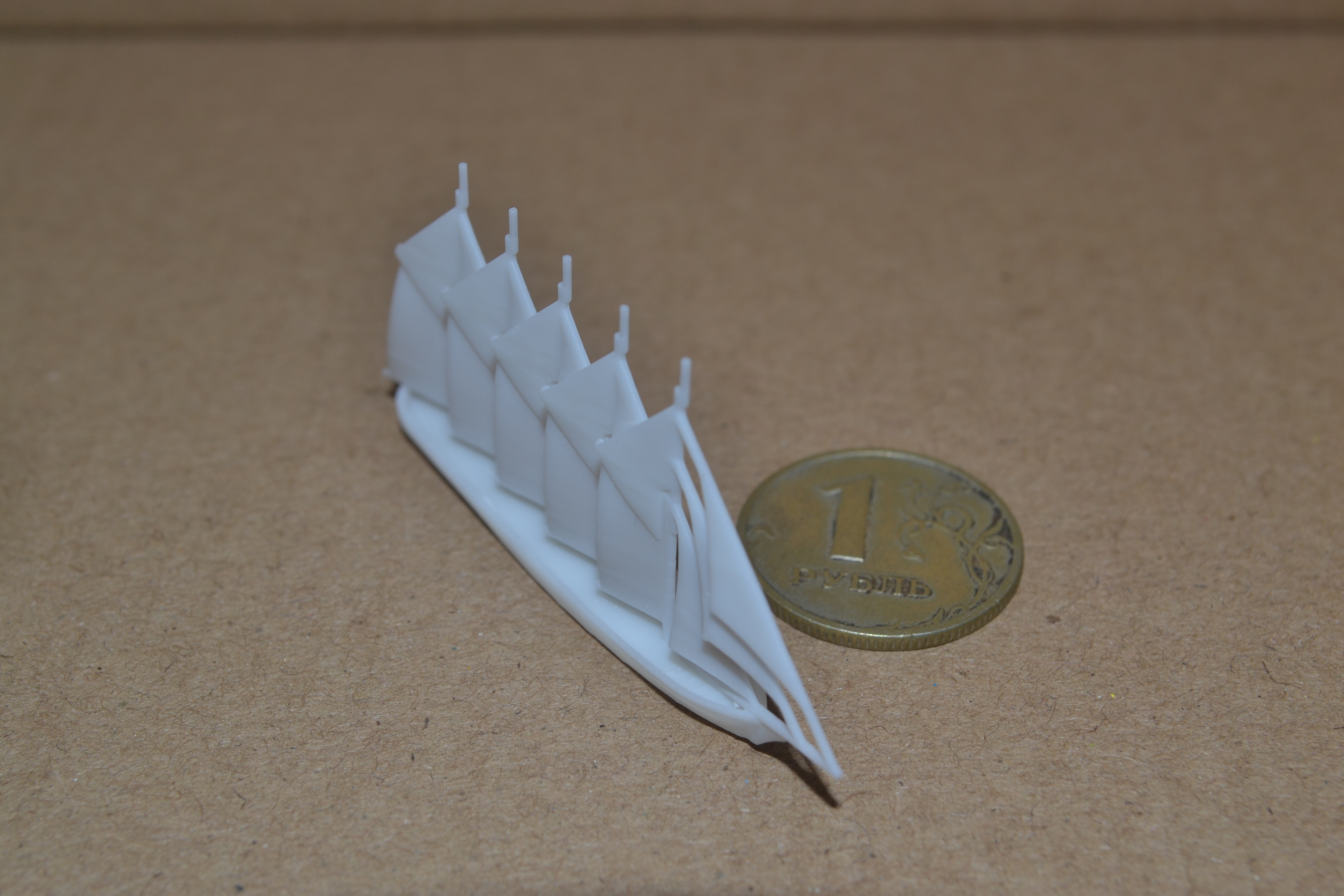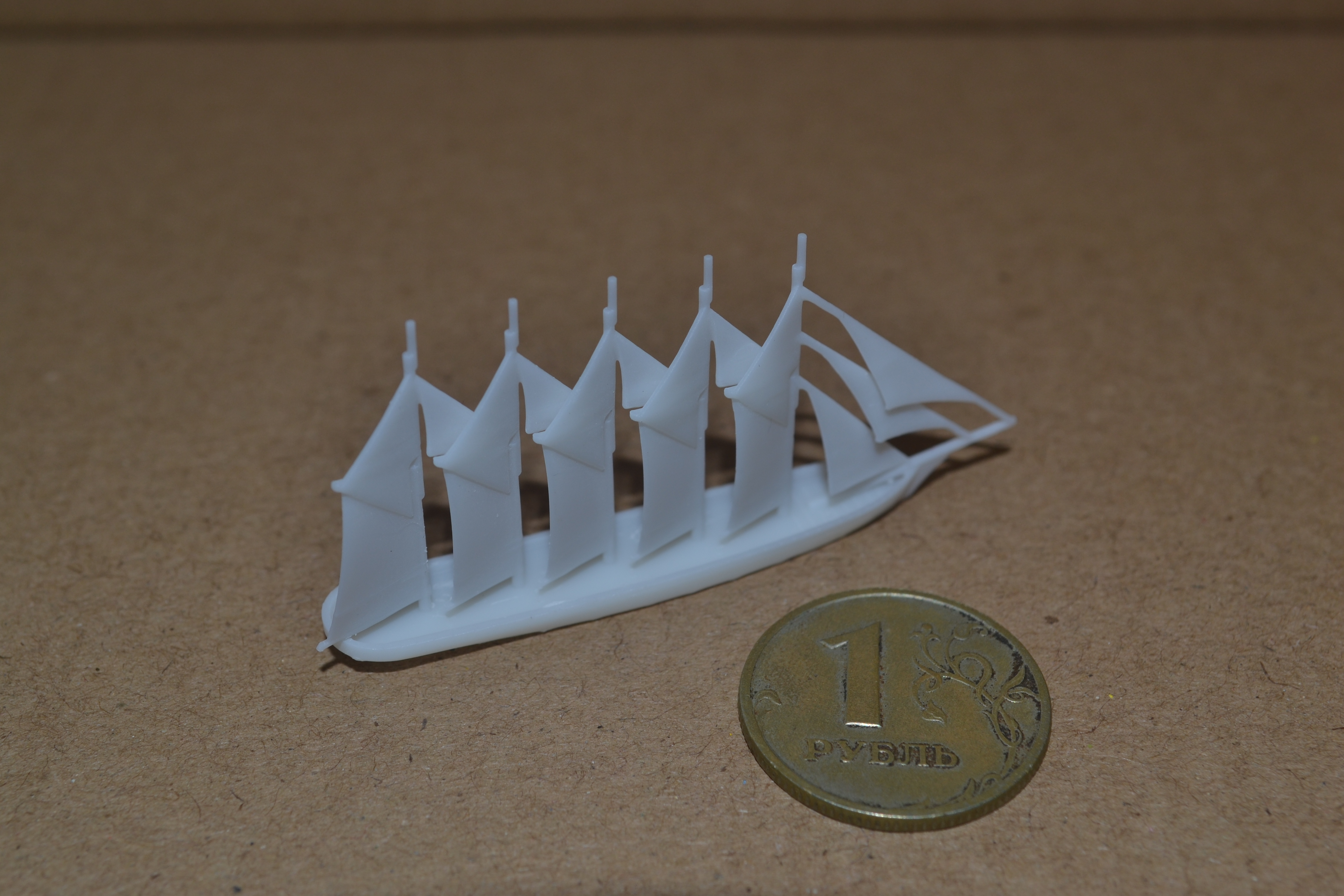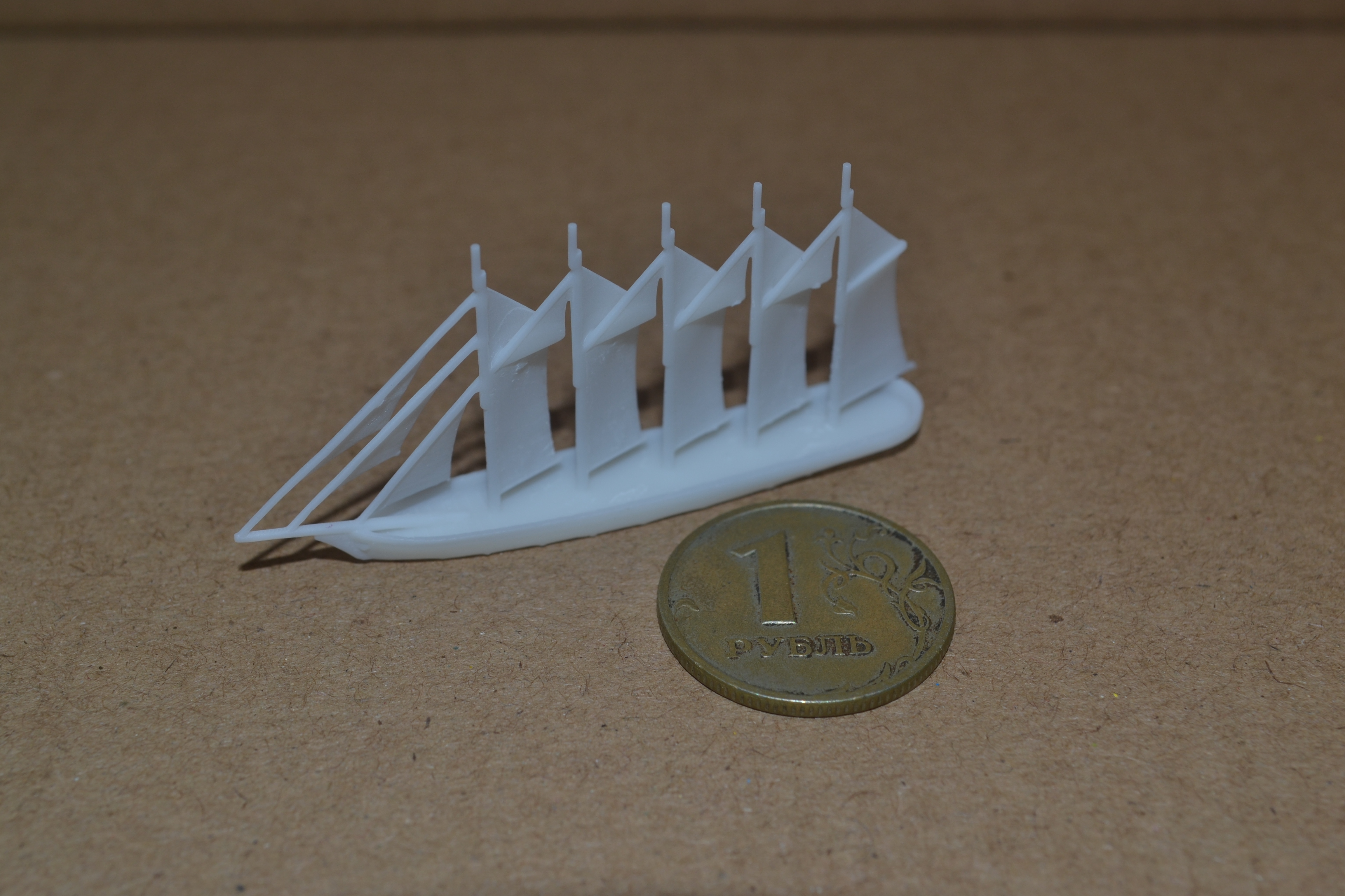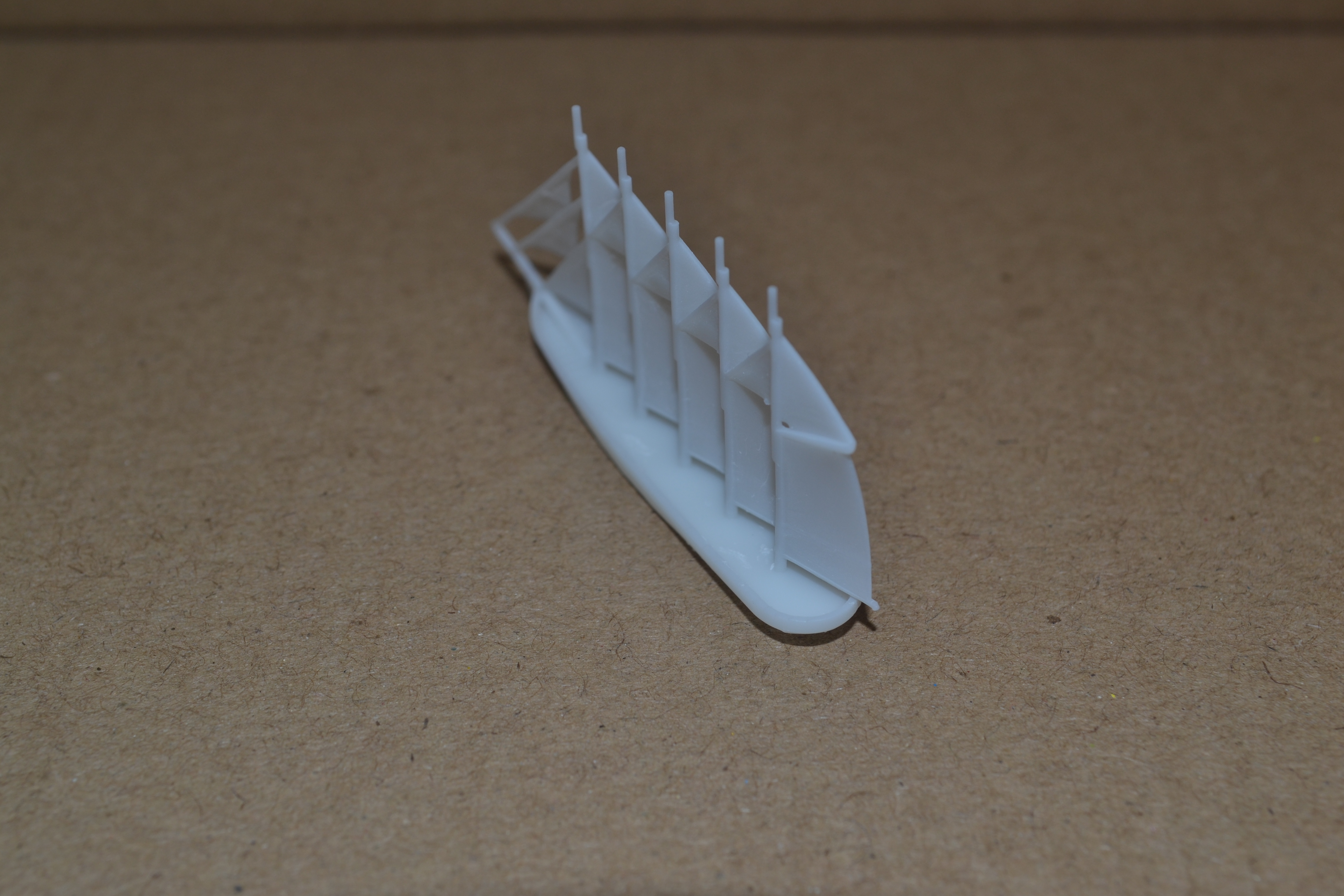 The other ship I printed yesterday is a five-masted schooner, also in 1:1800 scale. Like the Borodino-class, this type of ship was used during World War I, but developed much earlier. This print is one that I need to modify, because my software placed unnecessary supports about the sails, which I can't completely clean off without power tools. Assuming my next test, with those supports completely removed, is successful, then I will make it a point to print all sailing ships the same way, and save on clean-up time.