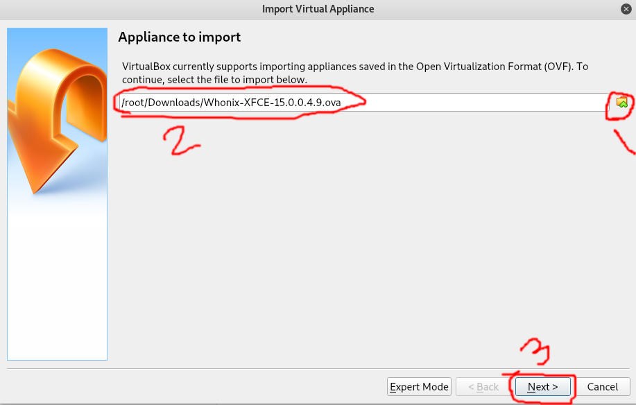 Creating a Whonix VM is extremly simple. Simply hit Ctl + I or go to File-Import Appliance. You should see the following. Click the button to the right and choose the .OVA file you downloaded earlier.