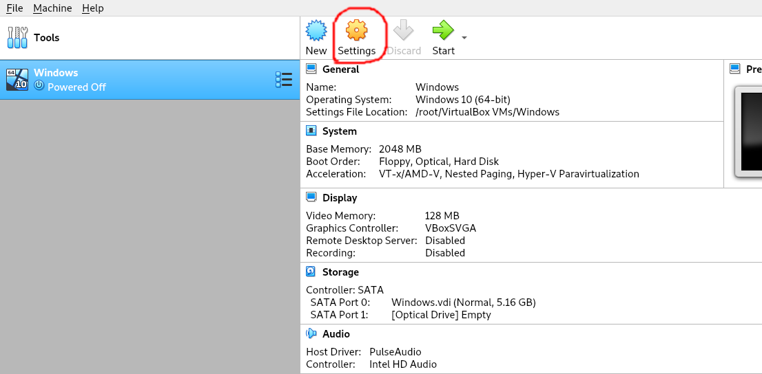 After creating the hard drive It should then return to the main program. From there select your machine to the left and click settings.