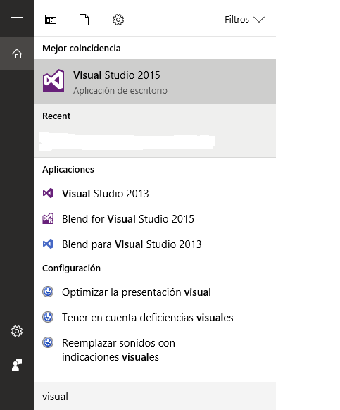 Una vez instalado, vamos a Cortana y buscamos Visual Studio: