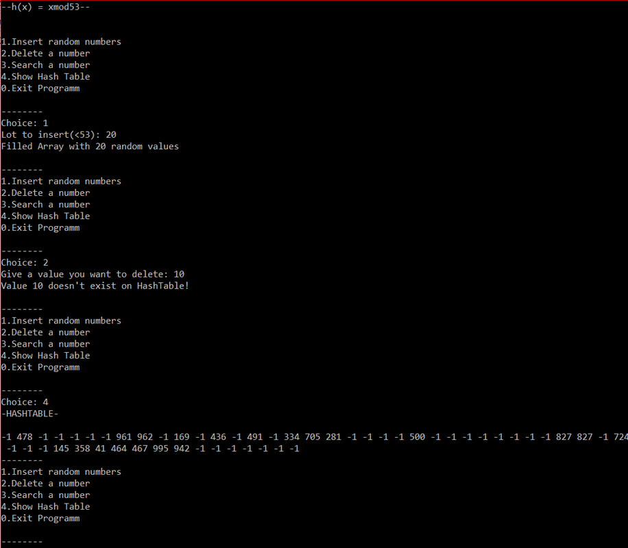 Beim Löschen von einem Element fangen wir beim eigentlichen Hash-Index an und führen die Such-Funktion aus, die wir bereits vorher implementiert haben. Wenn der Wert gefunden wurde wird das Element bei diesem Index dann gelöscht, dass geht sehr leicht indem wir den Wert auf '-1' setzen. Das sieht in Code wie folgend aus: