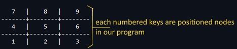 Each node-position is a key in our dictionary and the values (X or O) can be stored in any of those keys. I illustrated the numbered node below, we are following this simple grid representation.