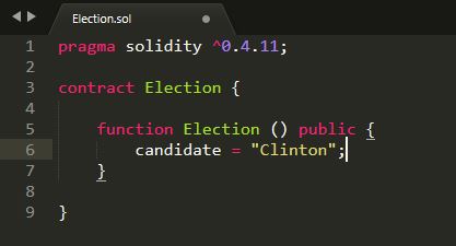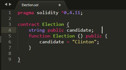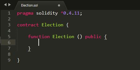Now we're going to define a function called "Election". This will tell Solidity that we're creating a "constructor". The constructor will hold a value, the name of our first candidate. We'll start by entering: