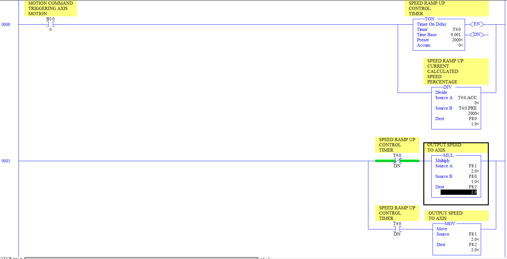 You can see here, once the motion command is issued a timer begins. This timer has a preset for the time duration of the ramp. In this case 2000 is equivalent to 2 seconds. So this ramp will happen over a 2 second time frame. At the instance the axis sees the move command, the current speed would be (0 / 2000) * Set Speed.