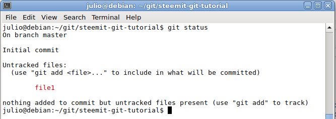 As you can see, we've received a message saying that this file is an untracked file, that means that the repository knows it's inside the folder but it doesn't know it should be tracking the changes of this file. So, in order of getting our repository to start tracking the changes in this file, we need to add the file to the repository by typing executing the command git add file1. After executing the command, we type git status again so we can see the difference.