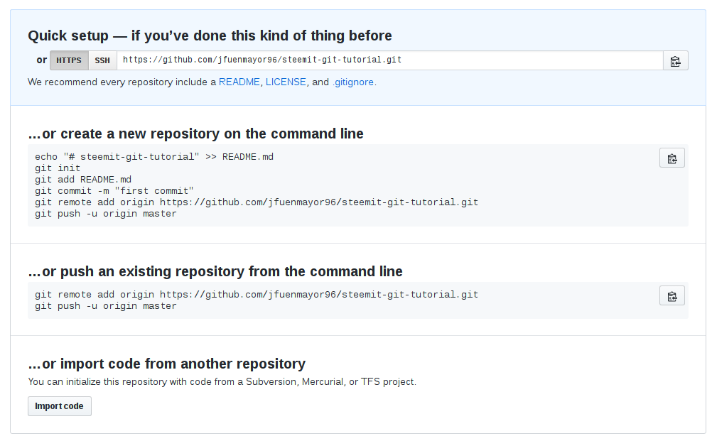 Once we have finished filling the basic information (repository name and description), we create the repository by clicking the green button that says Create repository, and we should see some instructions like these ones: