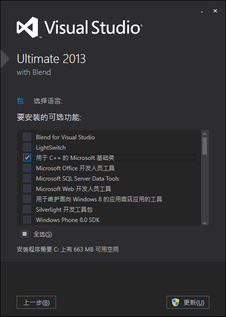 在选择需要安装的项目时,选择Visual C++一项就可。其它的项目可以不用选择( C++开发选择这一项即可。)