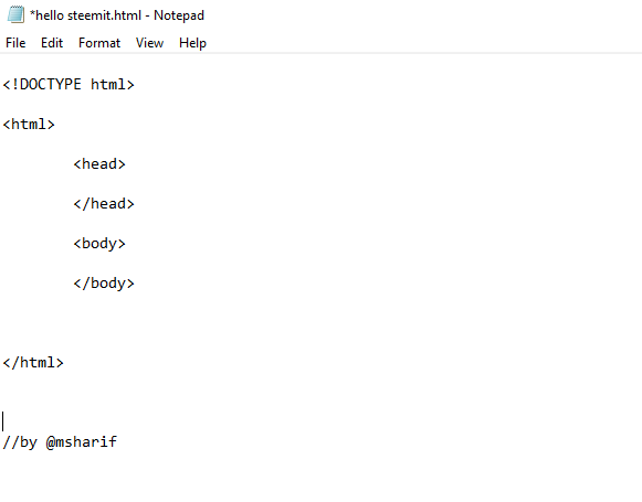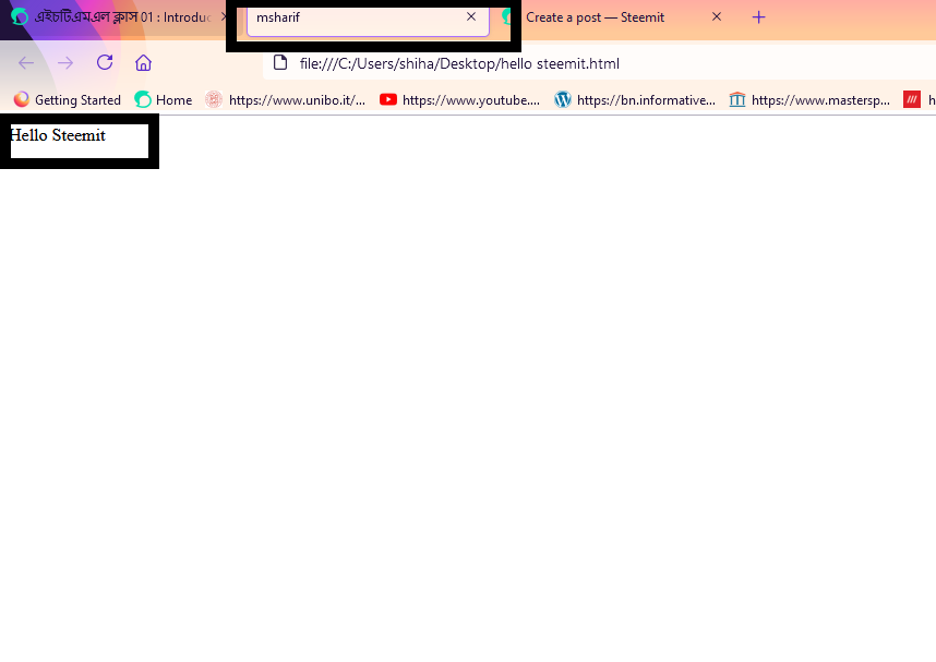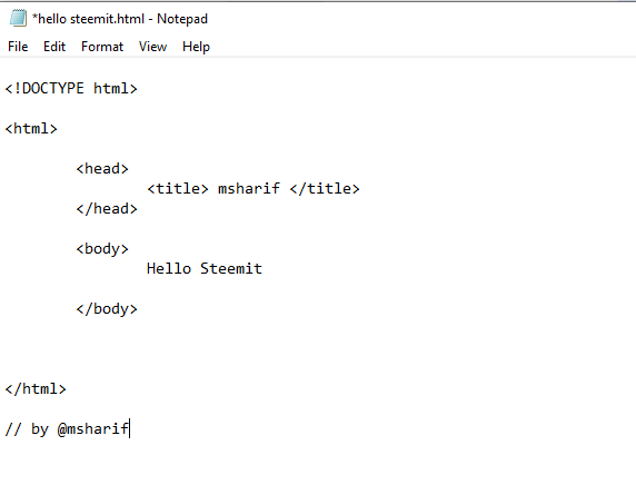 এরপর যখন আপনি head এরমধ্যে title বসাবেন এবংbody এরমধ্যে কনটেন্ট বসাবেন তখন আপনি যা লিখবেন তাই দেখাবে. এখানে আমি title লিখেছি msharif এবং body দেখেছি Hello Steemit.