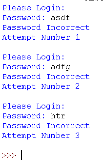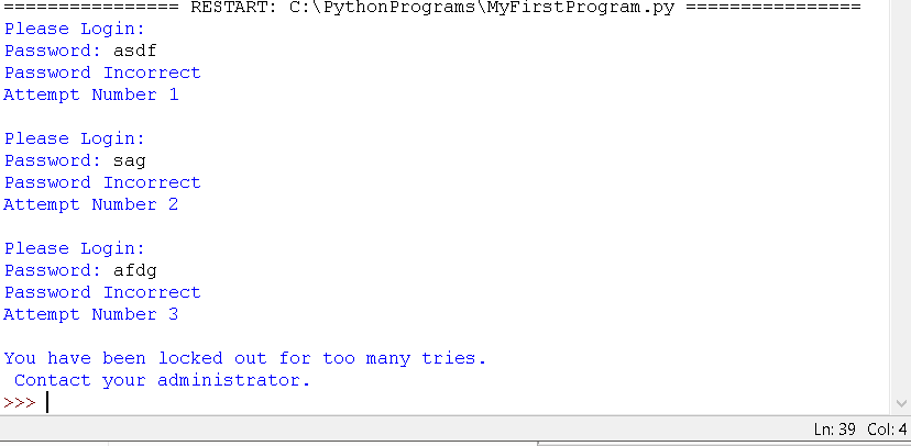 print("You have been locked out for too many tries. \n Contact your administrator.")