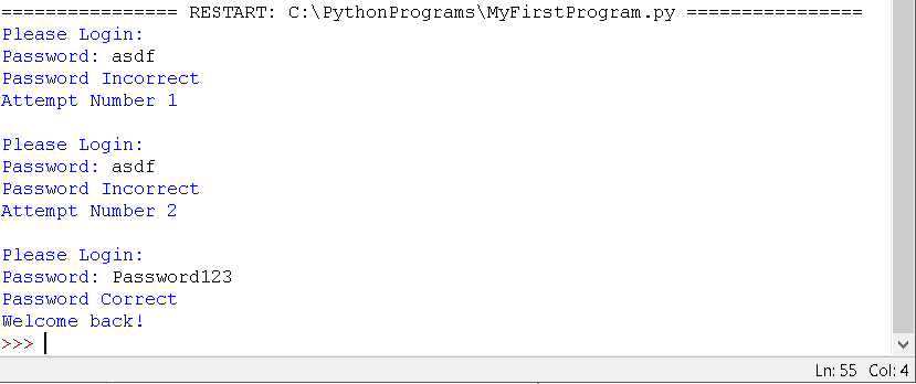 Now the program just ends even if we get the password right. We can fix this by adding some booleans that tell the program if the password is true or false