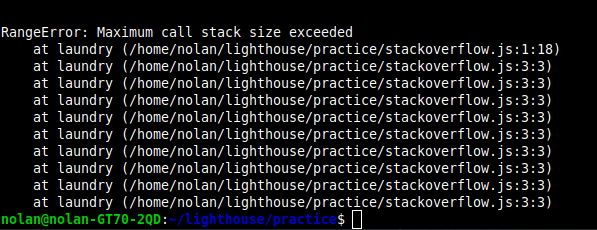 If you visualize the callstack as a washing machine, we are bringing our laundry() function to the washing machine which is where it will be held until "washed" however, what would happen if we never took our laundry() out of the washing machine?