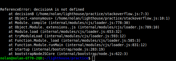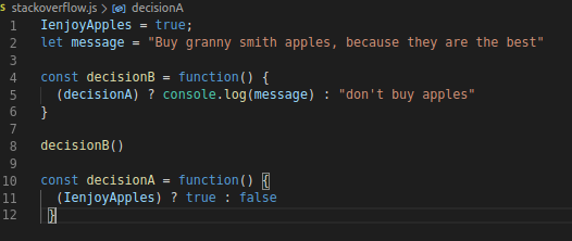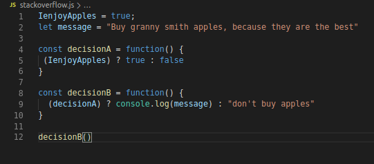 On line 12 we invoke decisionB (aka execute the script). All the functions in this script are then sent to our callstack to be processed. If we look into decision B we can see that it relies on decisionA, therefore decision A will need to be processed aswell to return the data we're are relying on for decisionB. How we can make sure decisionA also makes it to the callstack is including it before we execute our script on line 12 this is because JavaScript performs synchronously, meaning, one at a time and "top to bottom". Because we need to use the result of decisionA as data to for our decisionB we need to make sure we invoke decisionA so we can have it added to the callstack.