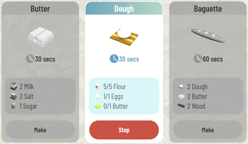 The idea of the game is to produce items on your farm, such as wheat. You can then buy facilities such as a mill to turn the wheat to flour and get a higher price for it. Ultimately you can bake baguettes by mixing different production processes and ingredients to produce baguettes which will make you a lot more money.