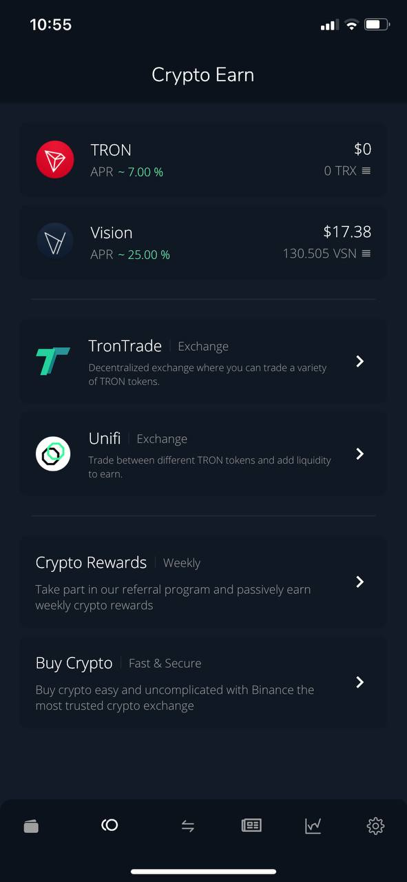 In Crypto Earn you have the chance to generate passive income by staking your Coins. Currently only TRON and VSN are generating rewards. Also you have direct access to exchanges to trade Crypto.