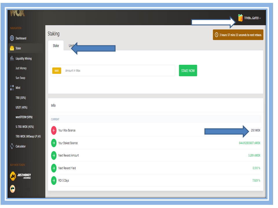 Secondly, after being inside the platform we must verify that our TronLink wallet is linked to the DeFi WOX-EXCHANGE. Subsequently we must locate the Stake and give it Clip, in my case I already had 250 Wox Token that I had acquired previously in @>@justmoney.exchange , as shown in the image.