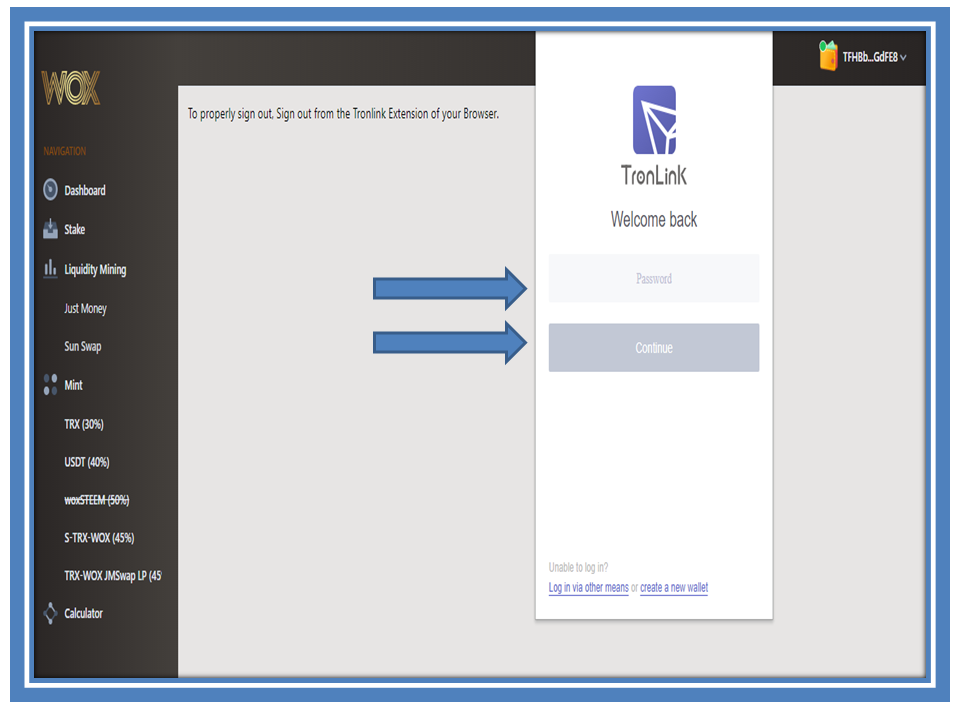 To get started we must enter the @wox-exchange,application, as shown in the picture and also our TronLInk wallet by entering our users and password.