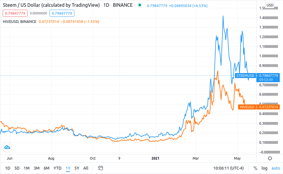Since then, the price of STEEM has almost always been higher than HIVE, in fact, the distance has gradually increased to this day. We see that STEEM and HIVE prices always go up and down in a similar pattern. This is because the bitcoin price affects all altcoins, resulting in a similar pattern of fluctuations. Meanwhile, around the end of March 2021, the price of HIVE exceeded the price of STEEM for a while, but then STEEM overtook again and continues to this day.