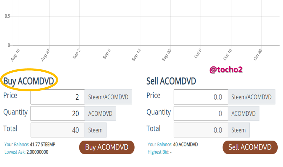 - Step 4: search for “Buy ACOMDVD”, and place the amount you want to buy and the price of the token in Steem because the exchange is done with Steem, obviously you must have it available in your Steem Engine Wallet, and if you don't have it, here I will teach you how to acquire it myself.