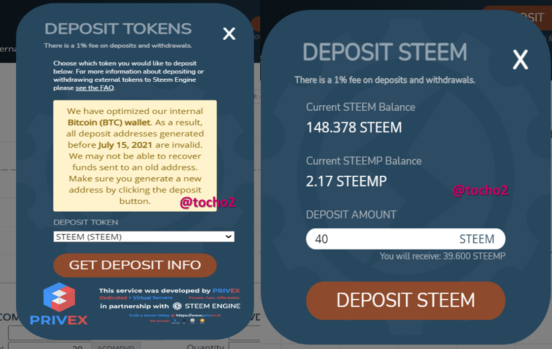 - Then you will see "Get Deposit Info" and enter there, when you open the next window you will place the amount of Steem you want to transfer to your Steem Engine Wallet, enough to buy the ACOMDVD you want. You give it in "Deposit Steem" and you will see them in your Wallet in a few seconds.