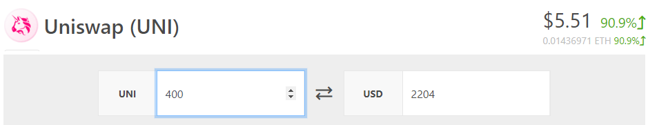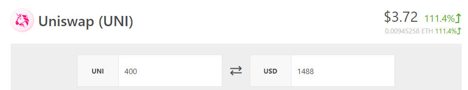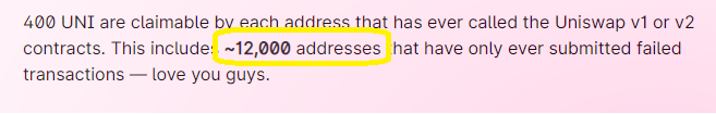 400 UNI are claimable by each address that has ever called the Uniswap v1 or v2 contracts. This includes ~12,000 addresses that have only ever submitted failed transactions — love you guys.