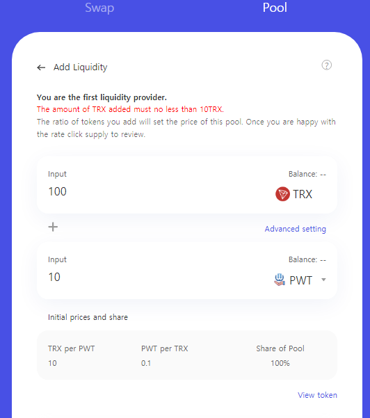 The amount needed for TRX is at least 10. If you are the first creating the LP, you can set up the price as you want. As an example in the image above 10 PWT was set for 100 TRX, which would place PWT at a price of 10 TRX per PWT.