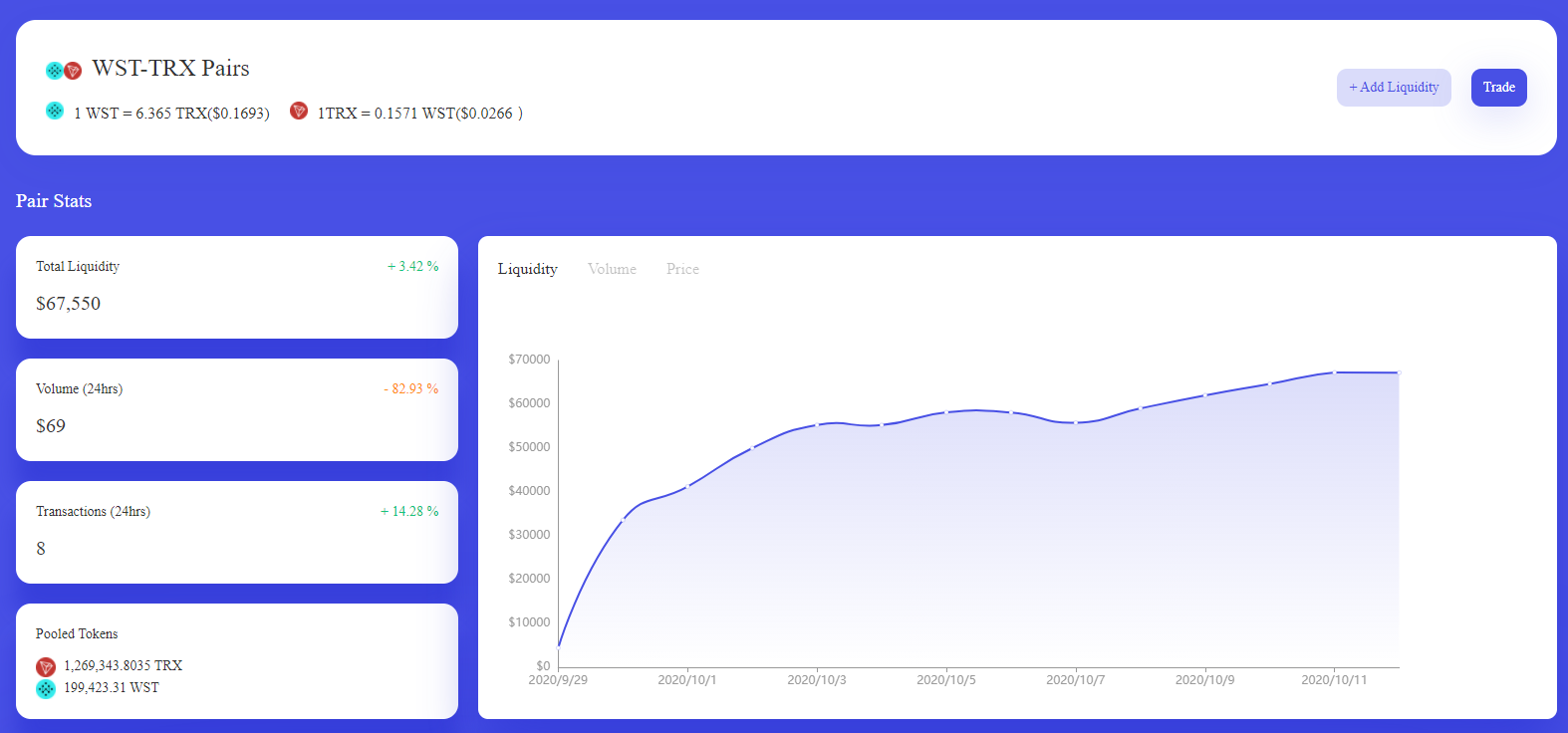 The pool size for WST-TRX is growing on a continuous base and is now about 67K USD strong.