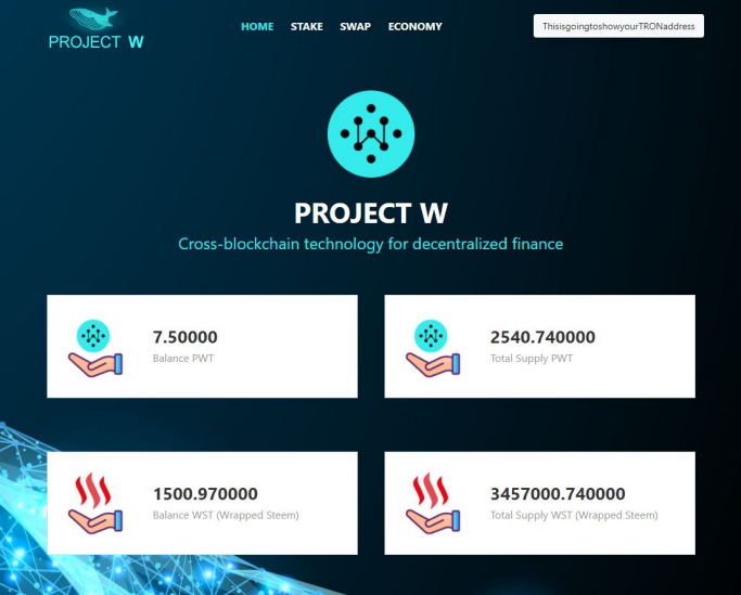 If you have connected your Tron address to Tronlink and logged in, you will see the current total supply of PWT (Governance token for Project W) and WST (wrapped Steem token on TRC-20) Additionally, you will see your own balance of both tokens.