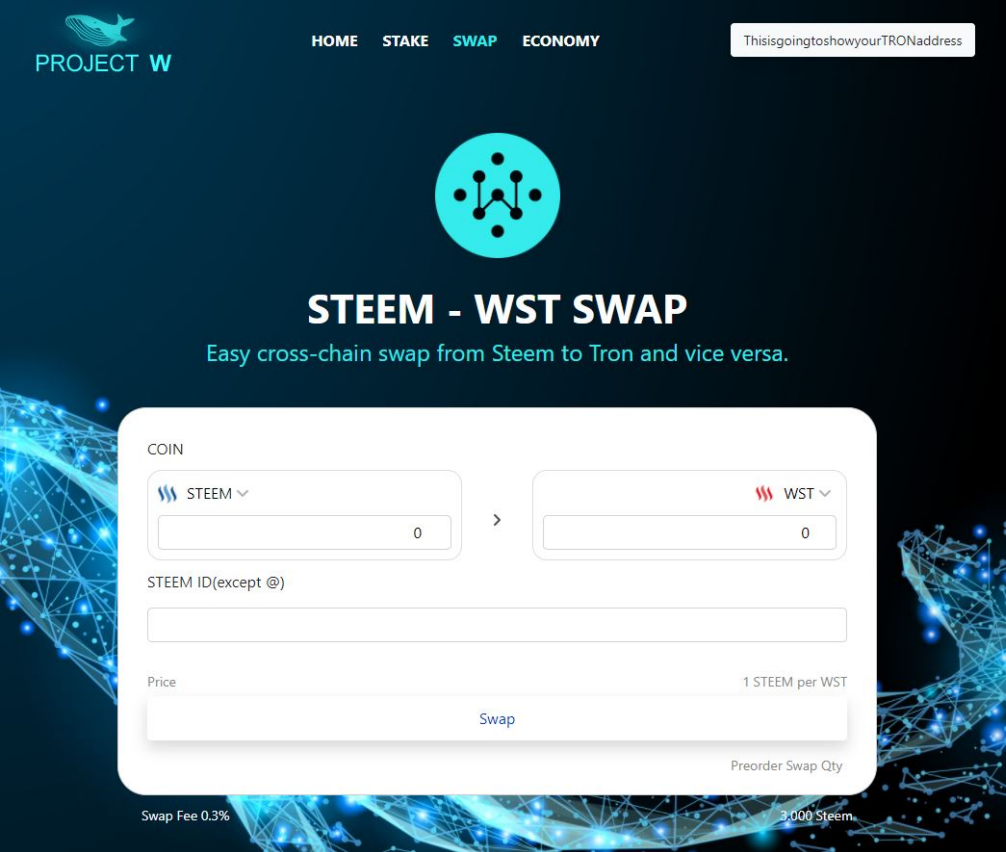 When swapping from WST to Steem you need only to log in to your Tronlink account. You can specify in the "STEEM ID" box which Steem account you want to send your swapped Steem. For swapping WST to Steem there is no minimum fee, but only a 0.3% fee. Please make sure that you have enough Tron or Energy for transactions on your Tron account.