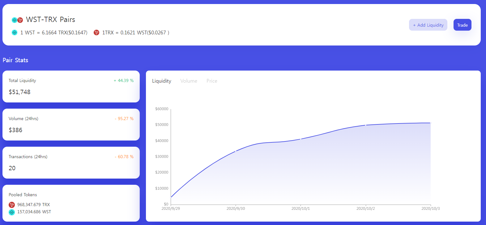 We have at the moment a liquidity pool of 51K USD, which includes in total 968K TRX and 157K WST. The trading volume for the last 24 hours is relatively low, as most of the WST liquidity is currently staked.