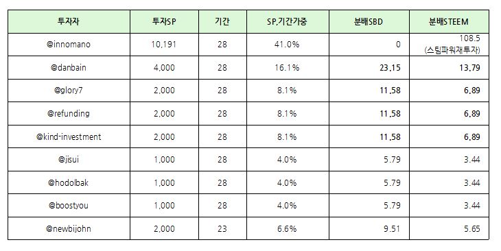 4주 수익금으로 5.79SBD, 3.44STEEM을 분배받습니다.