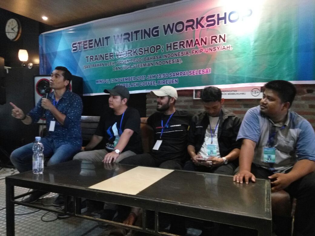 Pelatihan yang dipimpin oleh @hermanrn ini berlangsung seru yang dihadiri oleh Steemian papan atas dari Aceh seperti @ayijufridar, @abduhawab, @kemal13, dan @jodipamungkas.
