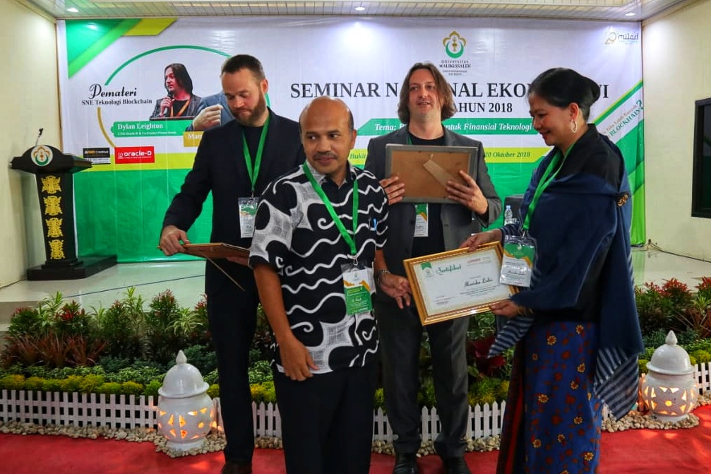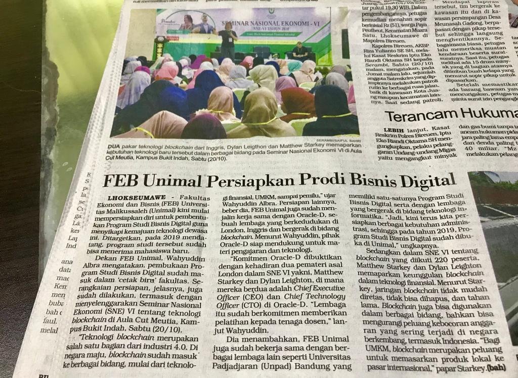 Kedatangan Chief Executive Officer @oracle-d Matthew Starkey (@starkerz) dan Chief Executive Technology @oracle-d, Dylan Leighton (@anarcotech) ke Aceh bertepatan dengan di agendakannya Seminar Nasional Ekonomi VI di Fakultas Ekonomi Bisnis Universitas Malikussaleh di Aula Cut Meutia, Kampus Bukit Indah Sabtu (20/10) lalu menjadi batu loncatan memperkenalkan tekhnologi blockchain keberbagai kalangan, momentum yang sangat menarik, selain bisa langsung diperkenalkan dalam forum formal, materi juga disampaikan oleh para expert yang telah memiliki pengetahuan menyeluruh dibidangnya.