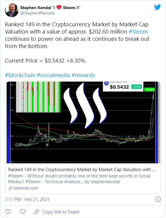 Ranked 149 in the Cryptocurrency Market by Market Cap Valuation with a value of approx. $202.60 million #Steem continues to power on ahead as it continues to break out from the bottom.