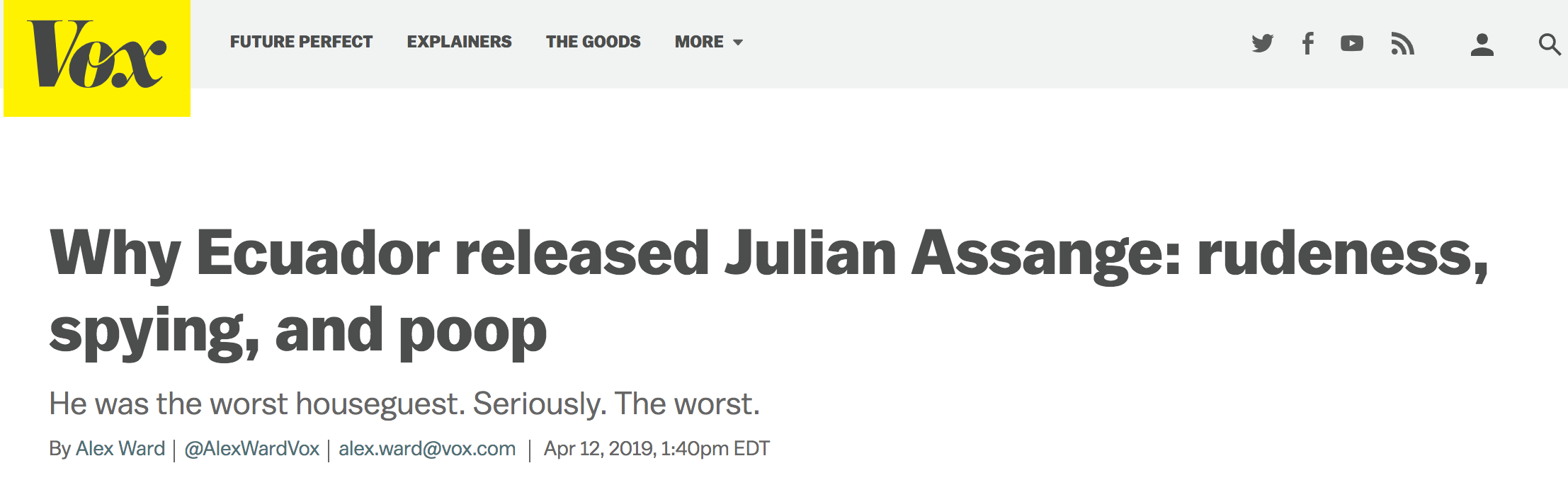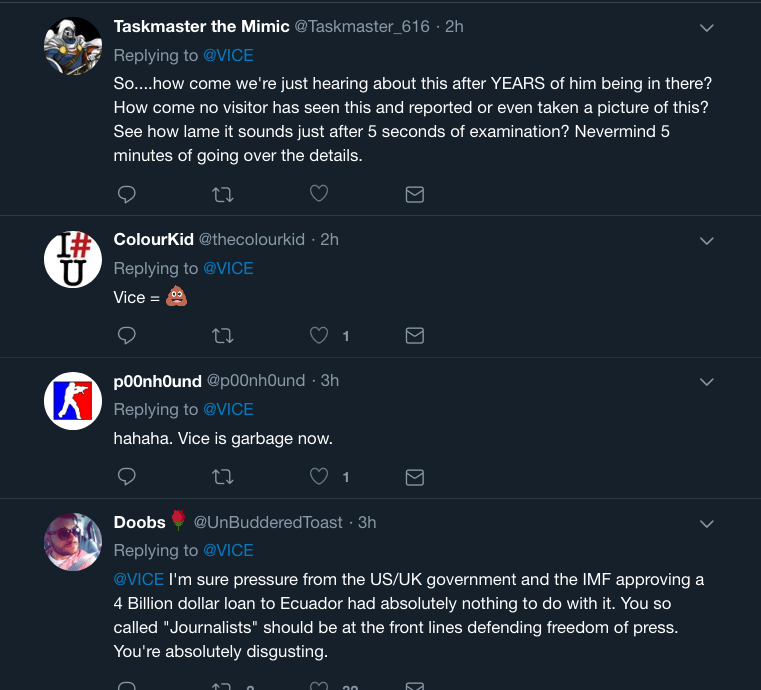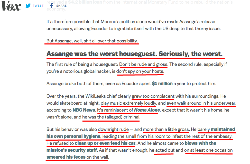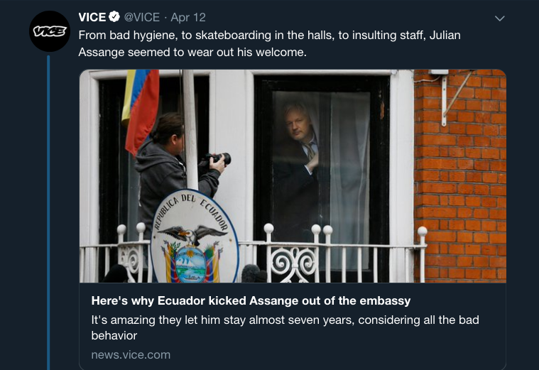 I came across this Vice article first which attempted to justify to their viewership why Julian Assange had been forcibly removed from the Ecuadorian embassy in London.