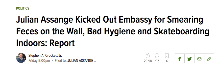Yes, you read that correctly, ”putting feces on the walls of the embassy and other behaviors of that nature.” The article goes on to complain about skateboarding and claims Assange's hygiene was unacceptable.