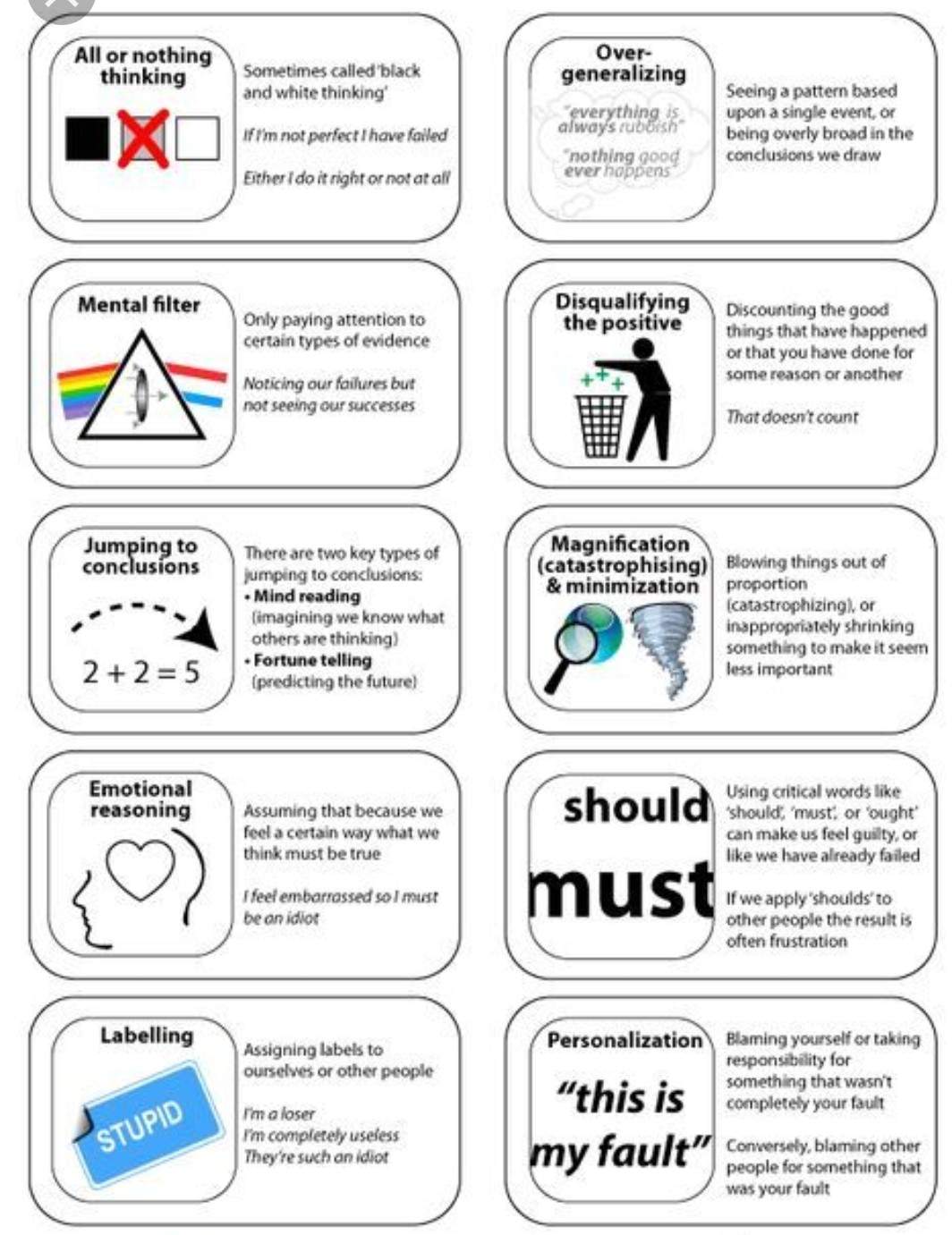 Below is a CBT worksheet that lists many of the common cognitive distortions that people have. You may find it helpful as a worksheet to give them. They can practice recognizing their own cognitive distortions.