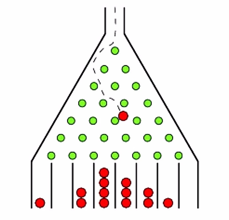 If a small ball is dropped on the top of the plate, the small ball will randomly pass through the obstacles of each block and eventually fall into one of the strong grooves. However, if enough balls are put in, they will show a clearly regular distribution on the hard grooves: normal distribution.
