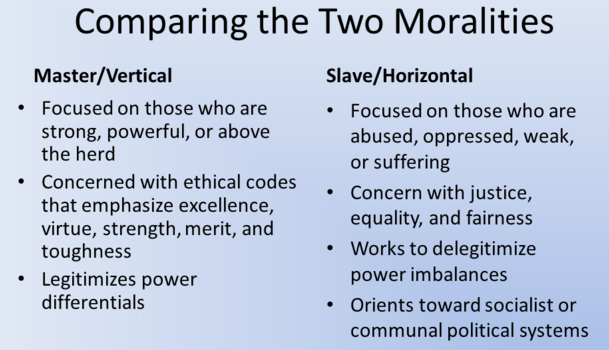 This is in direst opposition to those with the Master morality, who will strive to pull everyone else upwards.